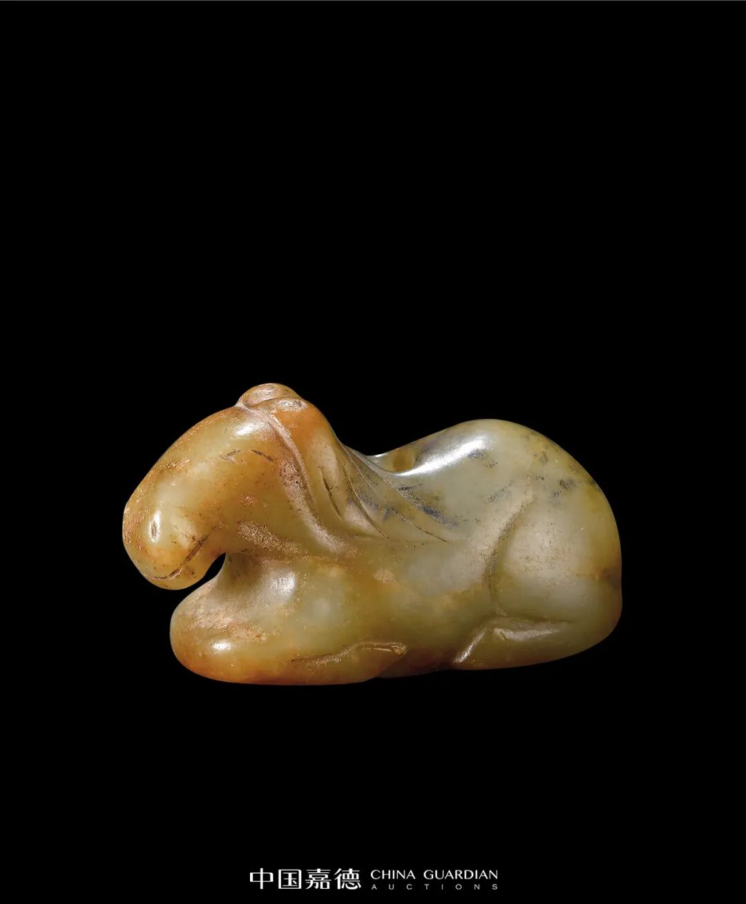 玉马玉质青白,圆雕而成,中孔,表面覆盖黄褐色沁,马作卧伏状,四肢盘曲,菱形眼,口唇紧闭,下颚线条优美,神情温顺,脖颈低垂,向下凝视,马鬃覆于颈背,马尾修长贴服于侧,马蹄刻划清晰。刻工简洁得当,鬃毛略加雕琢,丝缕分明,马身寥寥数刀,而矫健之姿宛然如生。