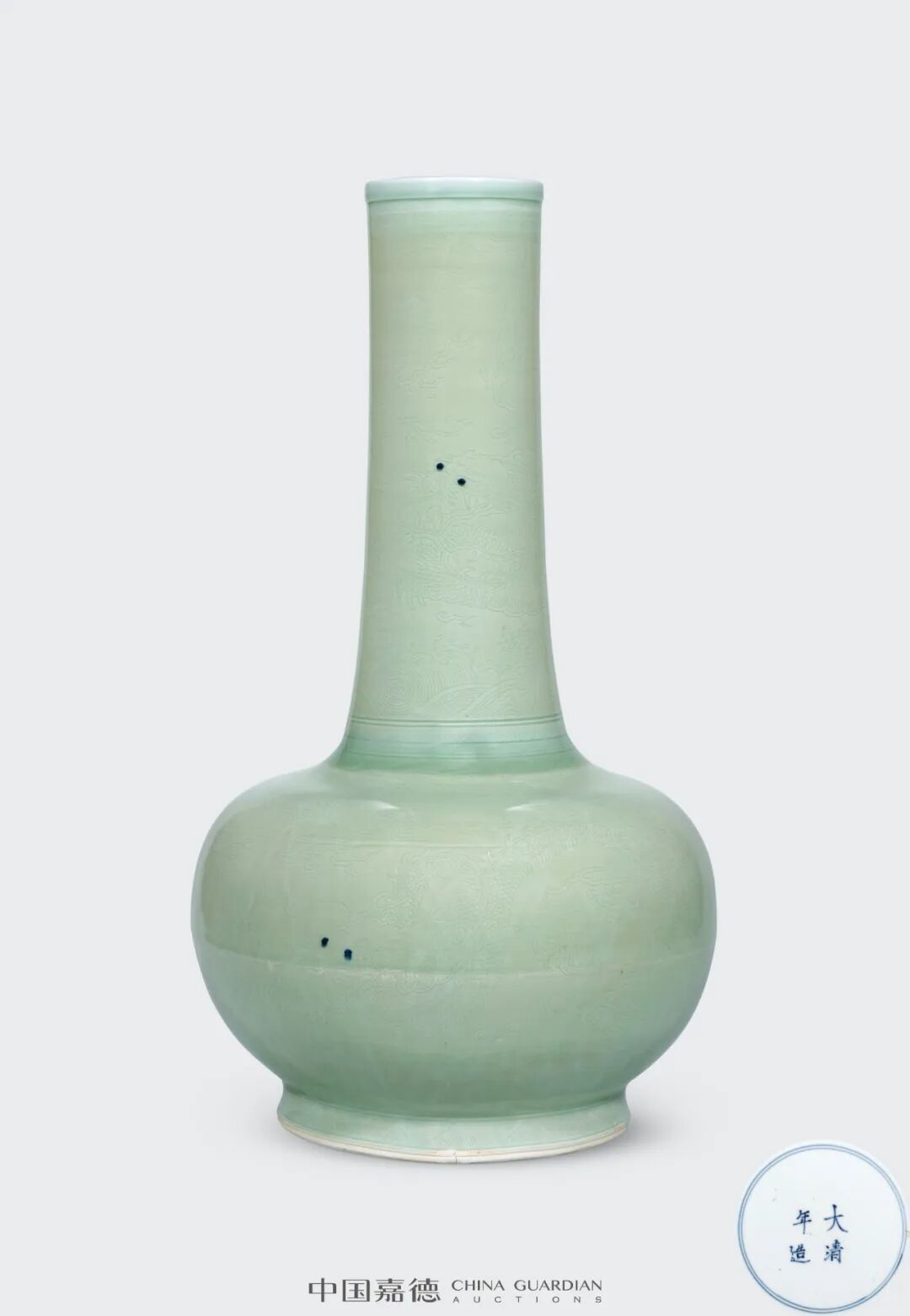 1、美国印第安纳波利斯约翰·赫伦艺术学院(John Herron Art Institute)麦基·威尔逊院长(McKee Wilson)旧藏;2、印第安纳波利斯艺术博物馆(Indianapolis Museum of Art)旧藏,入藏于153年;青釉是我国单色釉瓷器中最为古老的釉色之一,历经千年发展,至明清时仍延烧不绝。清初,景德镇吸收龙泉青瓷烧制技术,结合宫廷审美需求,开启了清代青釉瓷器装饰的新风尚。青釉青花暗刻云龙纹长颈大瓶即为经典之一,其体量硕大,气势恢宏,集暗刻、青花、单色釉装饰于一体,工序复杂,装饰新颖,堪称清早期单色釉瓷器中的佼佼者。![]()