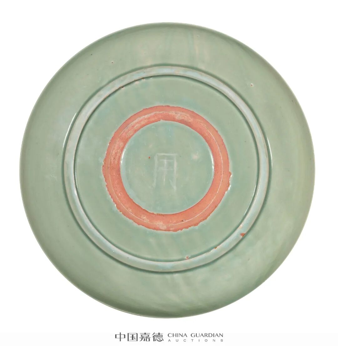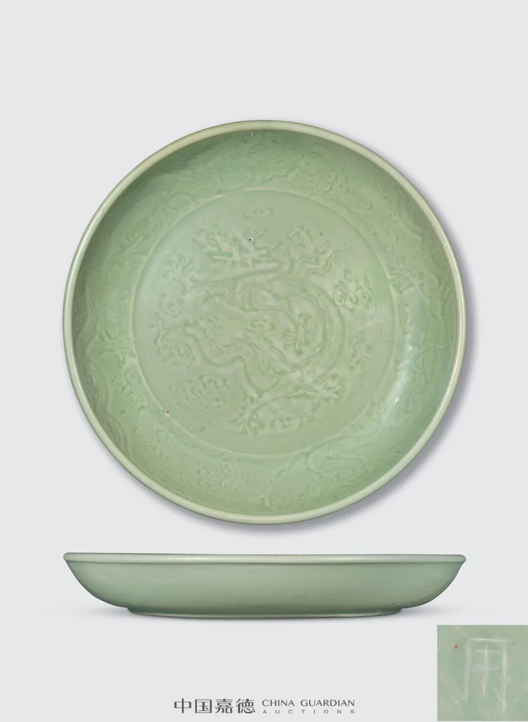 1、香港拍卖会,1990年3月20日,lot632;2、北京拍卖会,2001年12月10日,lot1734本品弧腹折沿,下承圈足,盘形硕大。黄釉地绘三彩纹饰,器内底绘紫、绿二色双龙戏珠纹,内壁绘四季花卉纹,内口沿绘云龙纹,外口沿及外壁绘赶珠龙纹,外底双圈内青花书“大清康熙年制”六字三行楷书款。康熙时期的素三彩器常以一种色釉为地,又以其他两种色彩绘纹饰,有黄地三彩、绿地三彩、紫地三彩等品种。此式黄地绿紫彩双龙戏珠盘,见有敛口及折沿两种样式,其中折沿盘尺寸更大,更具气势。与本品相近者,可参南京博物院藏品。龙泉古称处州,窑业久负盛名,《大明会典》载:“洪武二十六年(1393)定,凡烧造供用器皿等物,须要定夺制样,计算人工物料。如果数多,起取人匠赴京,置窑兴工,或数少,行移饶、处等府烧造。”说明在明代初期,龙泉窑与饶州景德镇窑具有同等重要的地位。将二者并置的文献还有《明宪宗实录》,成化元年(1465)颁布诏书:“江西饶州府、浙江处州府,见差内官在役烧造瓷器,诏书到日,除已烧完者照数起解,未完者悉皆停止,差委官员即便回京,违者罪之。” 龙泉官窑青釉暗刻云龙纹大盘即为明代早期处州龙泉官窑之精品。本品通体施青釉,足底内留露胎涩圈,并泛火石红色,表明此大盘为支圈垫烧而成。盘心及内部暗刻三条云龙纹,云龙身形遒劲,怒爪厉张,须发、鳞片等细节的刻画亦纤毫毕现,彰显了龙泉官作瓷器的制作水准。底部暗刻楷书“用”字款。![]()