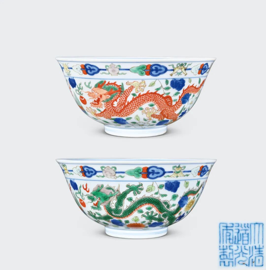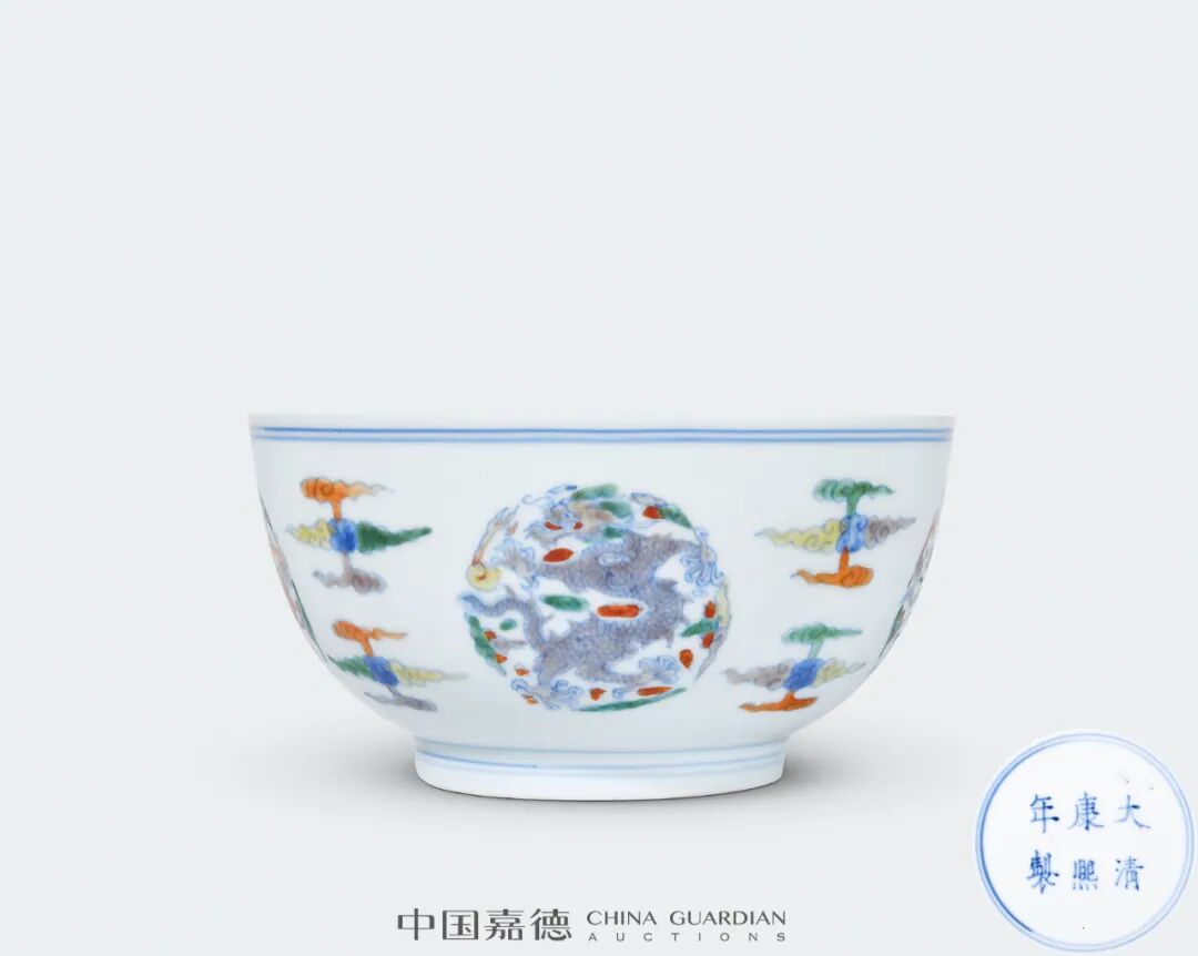 本品造型敦实周正,以康熙时期的创新技法内青花外斗彩绘就。外壁斗彩绘四组团龙戏珠纹,间以上下对称“壬”字形云。云龙神态威武,身形恣意。碗心绘青花夔龙穿花图案。素雅与明快融于一器,本品形制、纹饰均与北京故宫博物院馆藏清康熙斗彩团龙纹碗相类,可资比较。![]()