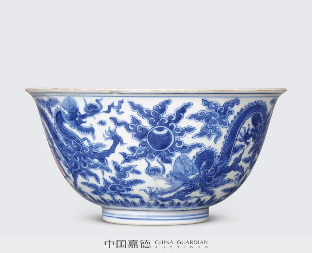 此品种以康熙本朝款鲜见,在市场中曾流通过两例,一例为云海阁主人张宗宪先生旧藏,一例为近期市场中释出的望星楼主人旧藏,均以善价易主。康熙皇帝凭借文治武功缔造了清初盛世,也诞生了被世人称道的如墨分五色的青花瓷,更将康熙龙纹的意气风发表现的淋漓尽致。回首前朝晚明之际,风雨飘摇,时代正在预示着一场变革,宫廷的开放态度,造就了青花瓷的蓬勃发展,体现戏曲人物、文人气质的瓷器如雨后春笋般出现,而作为宫廷代表的龙纹瓷器反而不为常见,下述一例青花云龙纹大碗虽未落款,但从装饰内容来看,仍透露着明末宫廷用瓷的气息,值得关注。