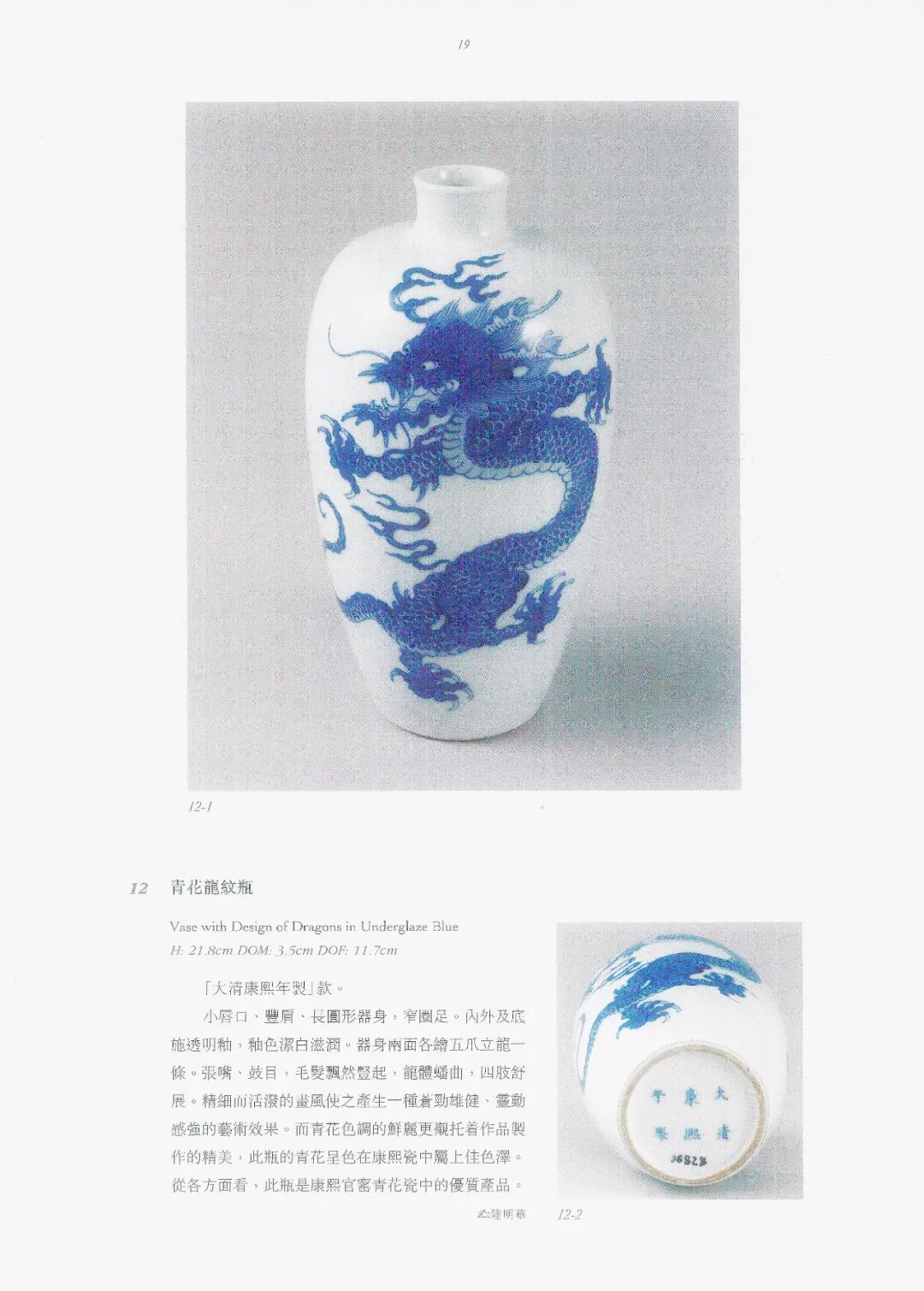 龙纹作为宫廷纹样之始,便与历代皇权的发展休戚相关。龙纹姿态既有呈现出皇朝初创时的凶狠威猛,又有太平盛世之际的俊美秀雅。清康熙青花云龙纹梅瓶即为这样一件具有康熙时期满清政权初创,充满着自信与豪迈气势的龙纹梅瓶。