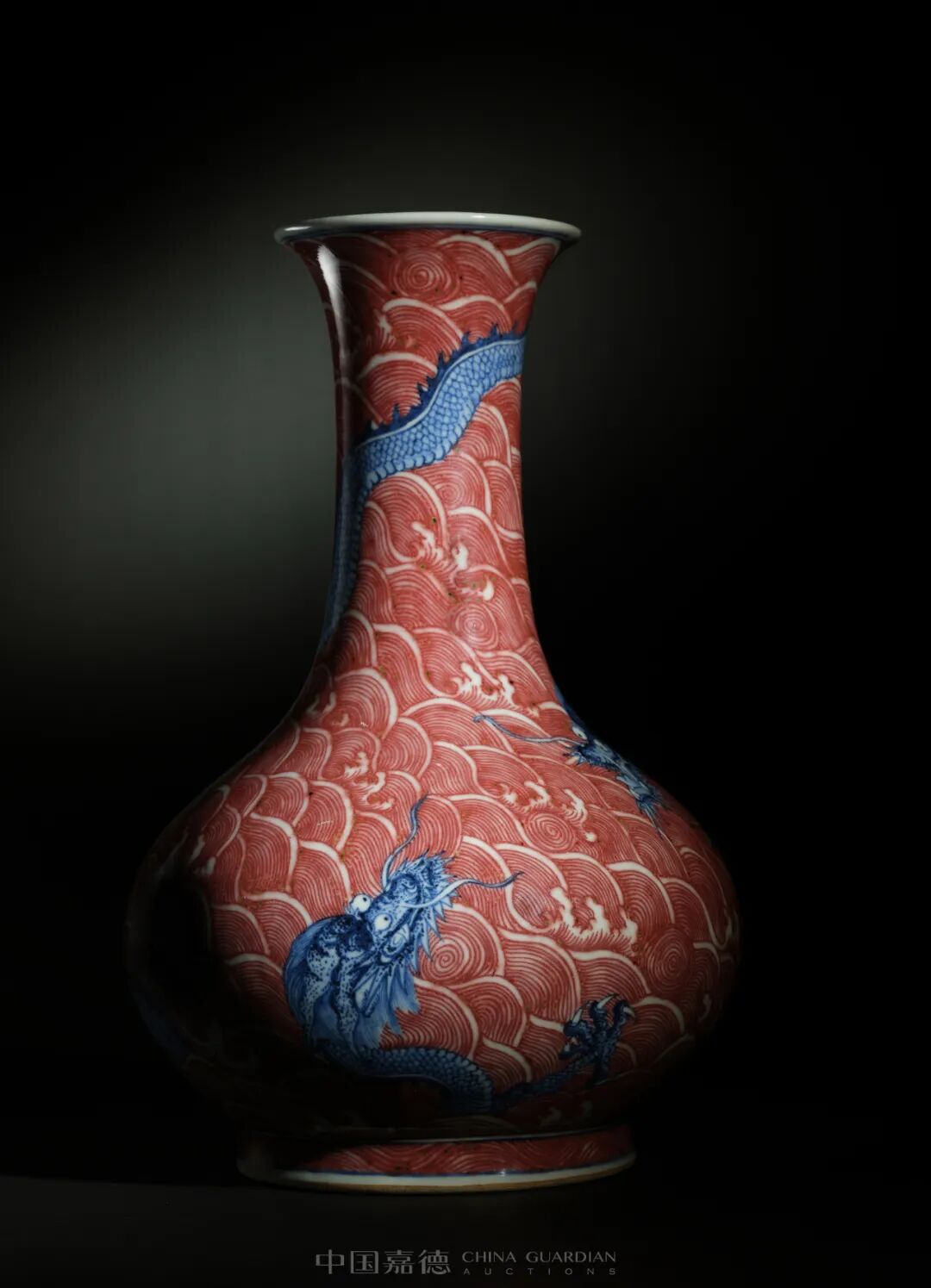 瓶以青花釉里红绘就海水苍龙教子图,与常见青花釉里红装饰技法不同,一改常见青花绘海水、釉里红绘龙纹的方式,而反之采用釉里红描绘细密整齐的海水纹,青花绘双龙,苍龙腾空而起,叱咤风云,虬躯矫健,大有气夺千里之势。幼龙破浪而出,昂首欲飞,与侧首下顾的苍龙深情对望。![]()