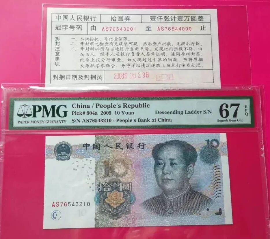 圈内一般对尾333、888之类的三同号称为豹子号, 4个尾号相同叫狮子号,5同号叫老虎号,6同号叫大象号,7同号叫恐龙号,8同号叫麒麟号。 物以稀为贵,顶配当然是8同号,每一个冠字号只会出十张,价格也是顶配了,目前05版人民币一张两冠的8同8的价格已经1万以上。 钱币的印刷每一批冠字号都会有一个开门号及一个关门号,开门号就是天字第一号00000001,关门号就是第一亿张的号100000000,这里就出现一个神奇的编码,人民币编号大家默认为8位数,关门号就出现了一个独特的9位编码。 如尾号为:678、5678、1234等为顺子号,而如9876、43210等,被称为倒顺子号,一般顺子号要受欢迎。价值最高的为8位顺子号,即:01234567、12345678或23456789,这样的8顺号一个冠里只有3张,价值也同8同号差不多。
