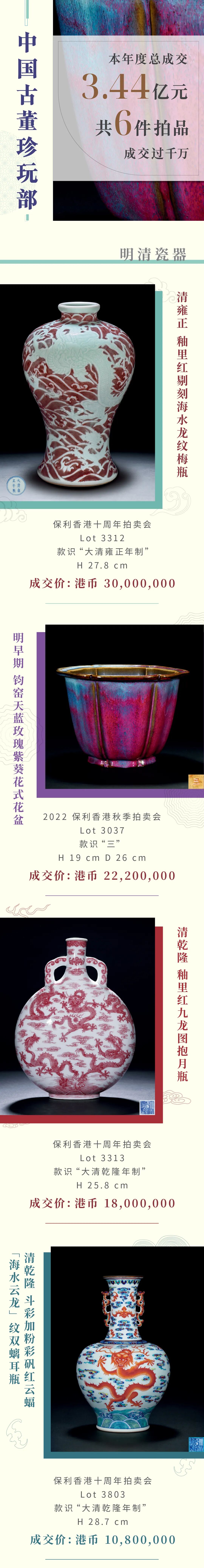 适逢保利香港十周年,中国古董珍玩部本年度六大专场及网络拍卖总成交额取得港币 3.44 亿元的傲人佳绩,更创下史上最佳唐三彩拍卖纪录,再度提振市场对唐三彩的信心。本年度最高价拍品清雍正 釉里红剔刻海水龙纹梅瓶以港币 3,000 万元成交,亦为本年度最高价的明清瓷器。本次秋拍封面作品明早期 钧窑天蓝玫瑰紫釉葵花式花盆以港币 2,220 万元成交,成绩亮眼。佛像方面,金 木雕彩绘菩萨立像两尊以港币 2,520 万元成交。青铜器方面则以商晚期 青铜兽面纹方彝为最高价拍品,以港币 1,020 万元成交。