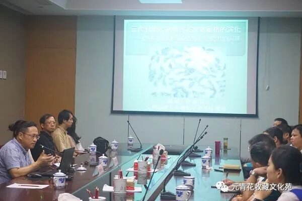 曾肃良教授用“简单、流畅、潇洒、空灵”八个字勾勒出元末青花瓷的特点,元青花上釉面的不同和青料的差异及两者的组合情况,将元代青花分为延佑期、至正期、元末期三个阶段。从元四家的写意风格娓娓道来,阐述了在至正时期已经孕育,到元代末期出现的潇洒画风,有了人物故事绘画以戏曲、小说人物在元代青花瓷器上体现,分析了元末期进口钴料、国产钴料用在瓷器上的差异,谈到了在元中期至正年,外贸需求的刺激使得元代青花瓷趋于成熟,在座人员通过大型投影屏幕清晰可见,现收藏于英国大维德基金会中一对至正十一年款的青花云龙纹象耳瓶的PPT。进一步地讲到了与波斯商人的合作,民族文化的融合,本讲座透过一幅幅缤纷多彩的画面,让我们一起穿越到古代,领略昔日的青花瓷,讲到了景德镇出土的元青花,落马桥窑址等,南宋时期,正值北方战乱,不少窑场工匠齐聚景德镇,加上高岭土资源,各种技法景德镇的制瓷高手已能运用到瓷器上,便利的运输条件促成了瓷都景德镇的伟大与辉煌。