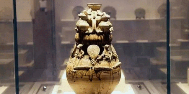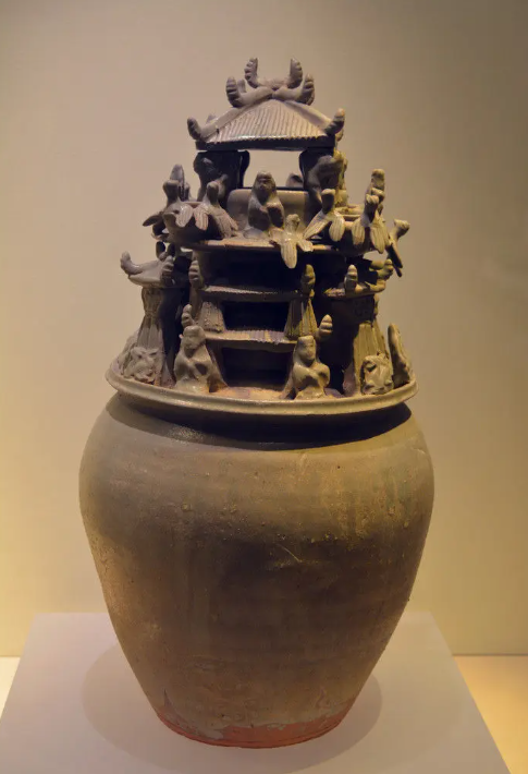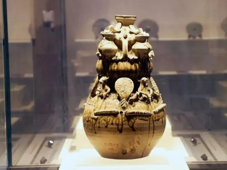 五联罐象征着财富层层堆积,子孙繁衍兴盛。根据堆塑物品的不同,五联罐也有其他名字,比如,飞鸟人物罐、百戏飞鸟罐、伎乐堆塑罐、谷仓罐等等,不过只有士大夫阶层,才有资格陪葬五联罐。