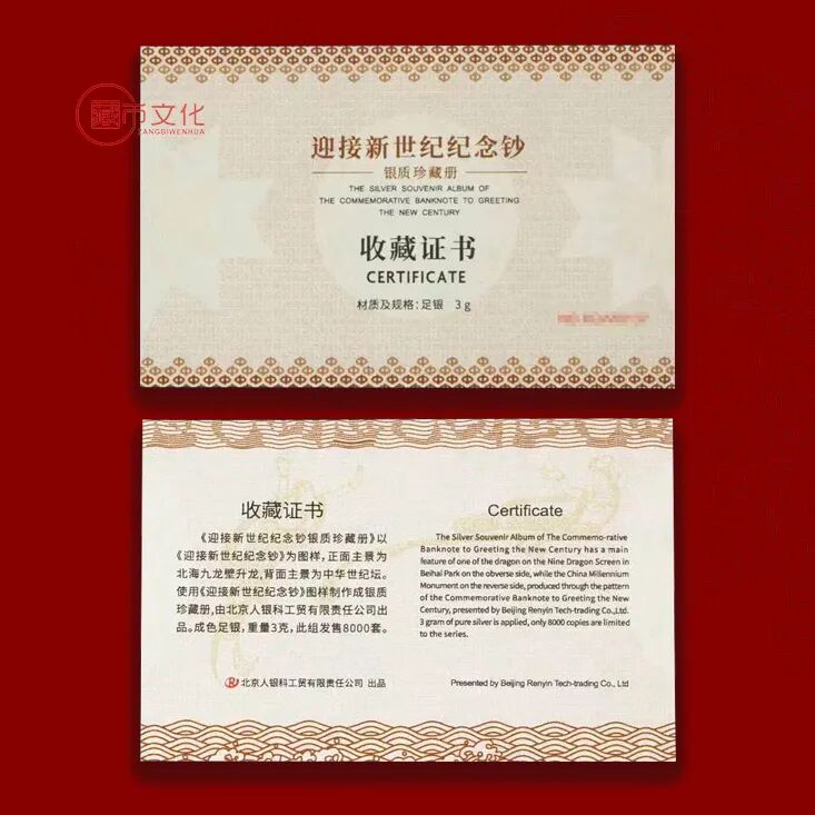 为献礼这辉煌盛世,纪念钞图样使用经中国人民银行营业管理部行政许可,北京人银科工贸有限责任公司权威出品了“龙腾盛世纪念银”一套,该套纪念银主图源自我国第一张塑胶纪念钞“千禧龙钞”,威武霸气,非常符合当今时代主题,东方巨龙已雄起腾飞。