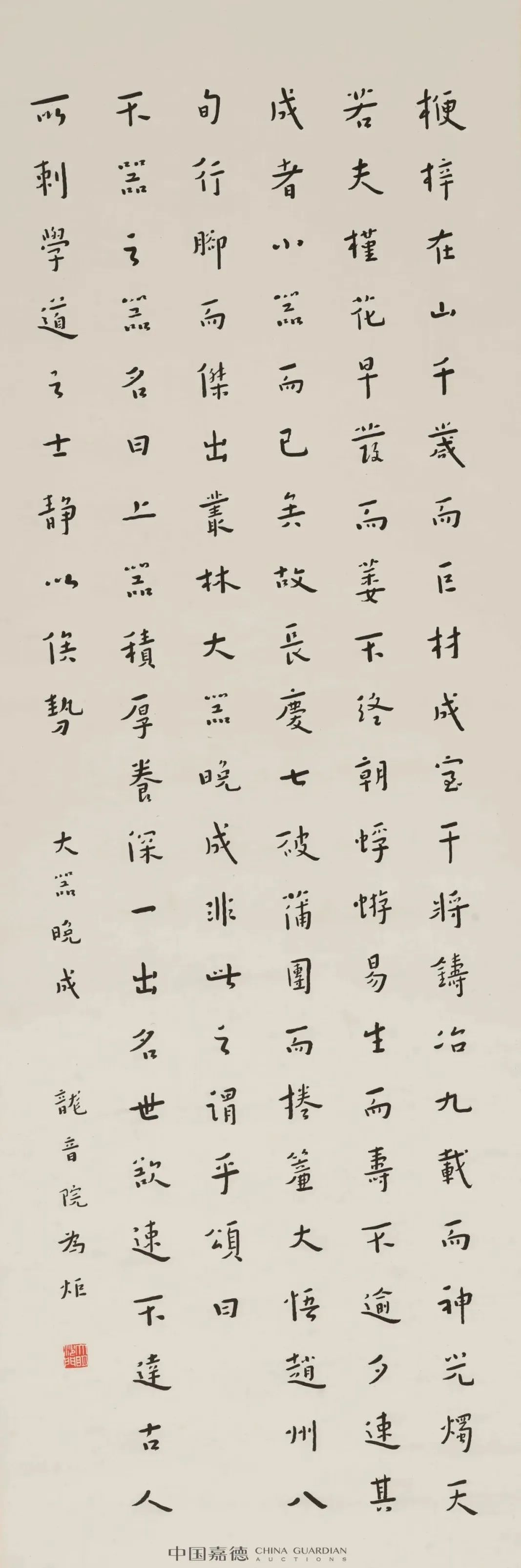 释文:楩梓在山千岁而巨材成室,干将铸冶九载而神光烛天。若夫槿花早发而萎不终朝,蜉蝣易生而寿不逾夕。速其成者,小器而已矣。故长庆七破蒲团,而卷帘大悟。赵州八旬行脚,而杰出丛林。“大器晚成”,非此之谓乎?颂曰:不器之器,名曰上器。积厚养深,一出名世。欲速不达,古人所刺。学道之士,静以俟势。1.“弘一大师墨宝展览会”,浙江温州师范学校,1944年秋。2.“弘一上人遗墨展览会”,温州五马街国货公司,1946年4月20-21日。3.“弘一大师遗墨展览会”,上海西藏路宁波同乡会会馆,1947年2月6-11日。4.“音乐家李叔同先生遗墨展览”,国立福建音乐专科学校,1948年4月3-5日。1.《温州日报》,1946年4月19日第一、三版。2.“弘一上人遗墨特辑”,《浙瓯日报》1946年4月21-22日。3.《弘一法师的遗墨》,《东南日报》(上海版)1948年4月11日。4.《弘一法师的遗墨》,《学僧天地》1948年第一卷第四期,上海静安寺版。5.《弘一法师的遗墨及其生活回忆》,刘质平,《中国民族博览》,2020年5月转载。6.《弘一大师全集修订版》第8册,第288页,福建人民出版社,2010年版。7 .《民国时期弘一法师墨迹展勘补辑佚》,王维军,平湖李叔同纪念馆,2011年版。8.《李叔同全集04》,第7章致刘质平,哈尔滨出版社,2014年版。9.《平湖李叔同纪念馆藏 李叔同-弘一大师手札墨宝识注考勘》,第126-127,西泠印社出版社,2017年版。1.《弘一大师遗墨》,第76页,华夏出版社,1987版。2.《弘一大师全集》,第九册书法卷,福建人民出版社,1992年版。4.《弘一法师书法集》,编号83,上海书画出版社,1993年版。5.《弘一大师遗墨》,上海书画出版社,2006年版。6.《弘一大师全集修订版》,第九册书法卷,第285页,福建人民出版社,2010年版。