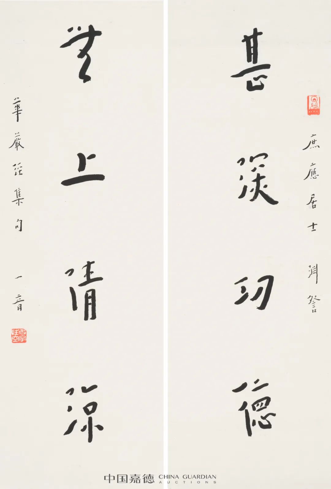 上款:林庶应(1906-1970),名纲答,庶应其字,号松青,福建永春蓬壶乡美中村人。在泉州开设源美商行,专营纱布批发业务。他善于运筹,分支商行逐渐发展至厦门、莆田、福州、柳州、台湾、日本等地。曾任泉州商会常务理事、福建省商会联合会常务委员、全国商联会代表和全国商会联合会理事等职。热心公益,倡办毓斌中学和建国商校。1949年,庶应离开厦门,到香港继续经营布业,创办友成船务公司,后又迁居台湾。说明:附“庶应”上款梁寒操、李云霄、陈肇英、丁则尚为林庶应作各体书法四帧。1930年初,弘一为缅怀其母七十冥辰而从事律学撰述,并集成华严偈联三百,分写三集,弟子刘质平见到后请为付印,于是他次年4月再撰序和卷后《华严经读诵研习入门次第》,至1932年始由开明书店石印而行于世。此四言联集自《唐译大方广佛华严经》,意思是法幽妙为深,深之极为甚;修行是功,德是得,修行有所得是功德;没有有能超过的;烦恼热恼,永远息灭。此联约书成于1930年代末期,此时弘一的书法面貌已由碑体脱化的体势较矮、笔画较肥厚的一路,转变为笔画偏瘦、体势偏高的风格,骨肉饱满匀称,即马一浮所说的“刊落锋颖,乃一味恬静”。其书落笔锋藏,笔一下而墨沉气注,行笔轻灵洒脱,但笔墨齐发,气力流于笔画间,一变雄浑厚实的质感和方截露锋的字形,而为瘦圆细润,更富于萧散冲淡的气韵。1939年4月17日至1940年11月8日,历时572天,弘一在永春普济寺静心修持,掩关治律,为弘一入闽14年,住锡闽南诸寺院中,居住时间最长久的地方。弘一入住普济寺后,遂谢绝一切,掩关静修,日以治定律典为常课,并题额其居曰“十利律院”,四壁挂满他手书的《古德经》警训,以自鞭策。弘一刚到蓬壶三角街时,即交代蓬壶邮电代办所经纪人林庶满:以后凡寄给他的信件,除丰子恺、刘质平、夏丐尊、叶圣陶、柳亚子少数人可送至普济寺外,其他一概退回原处。并自己把宣纸边角料裁成细条,亲自手书:“收件人不在,退回原处”,把这样一大迭字签留与代办所备用。可见弘一下了尽量谢绝尘扰,静心闭关治律的决心了。![]()