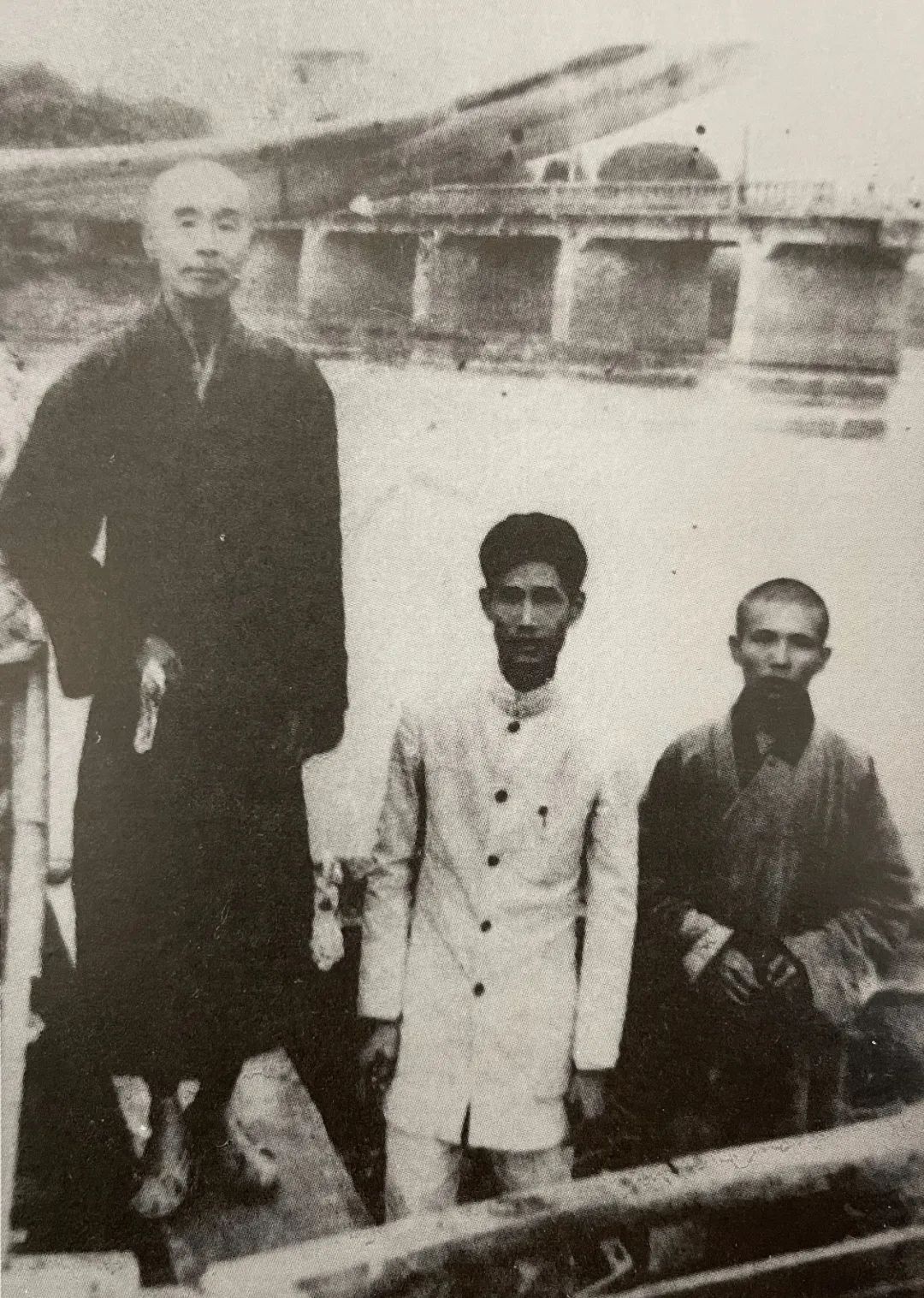 1940年弘一法师离开永春赴南安,与性常法师(右)、王梦惺居士(中)合影于桃溪竹篷船上。