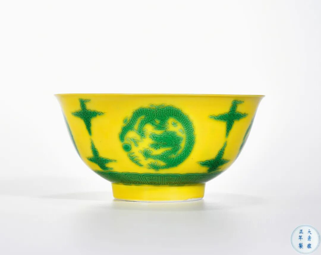 清雍正 黄釉绿彩暗刻团龙纹碗