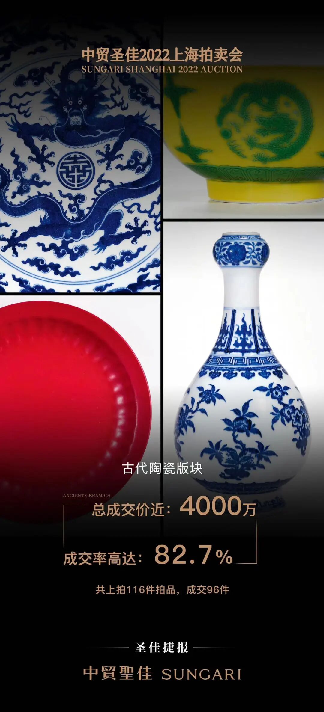 上海这场不分春秋的艺术品拍卖会平安圆满落幕,历经数月的封控及最近疫情限流外地入沪的不确定因素下,圣佳人凭着坚忍不拔的意志,逆流而上,再一次完成了几乎不太可能完成的任务,本次中贸圣佳上海拍古代陶瓷版块再次尝试将大拍规模的场次在完善做好品相状况直观呈现、文字精准描述的前提下,采取网络同步竞价模式,并取得突破预期的成效。