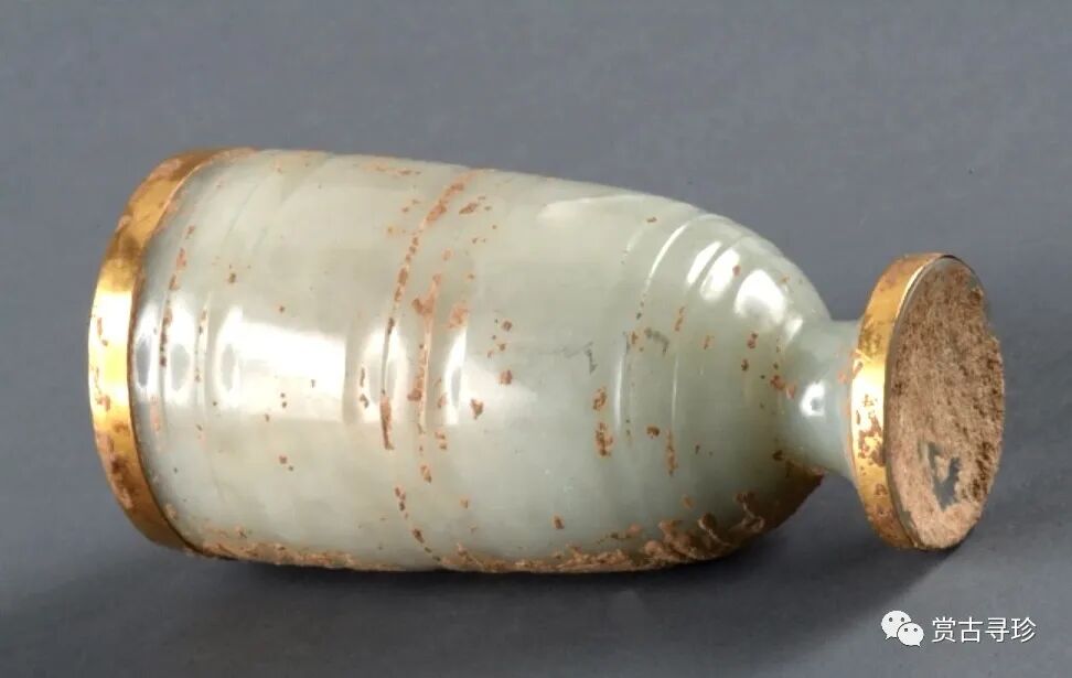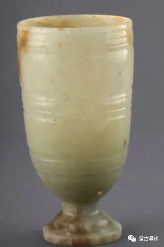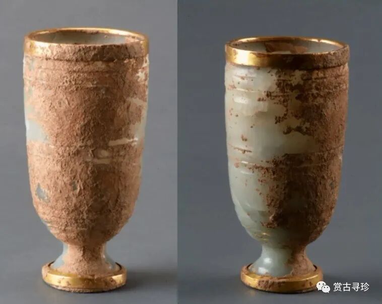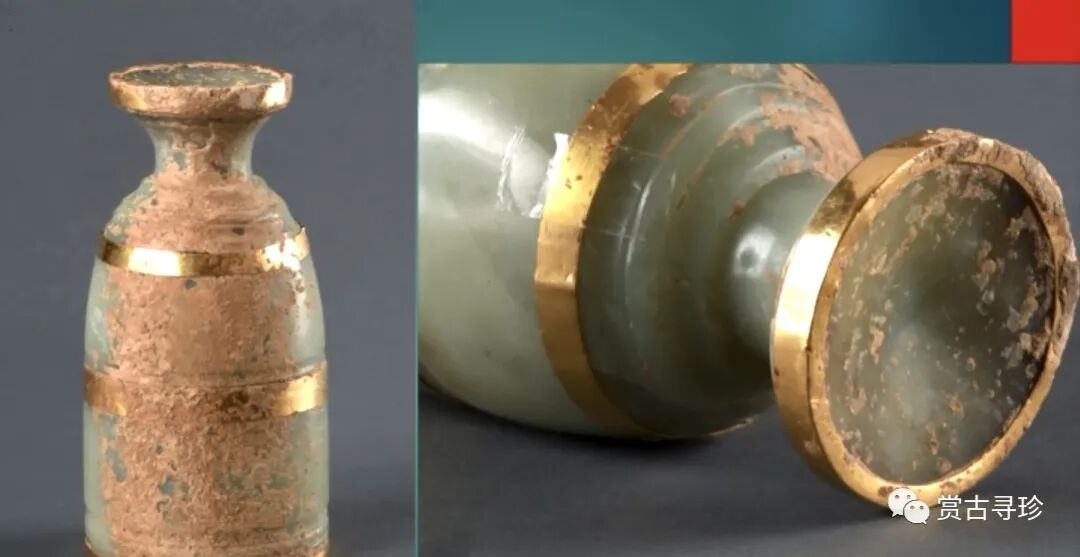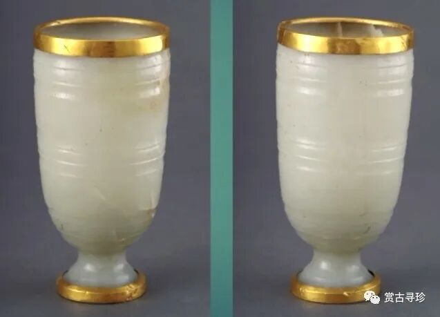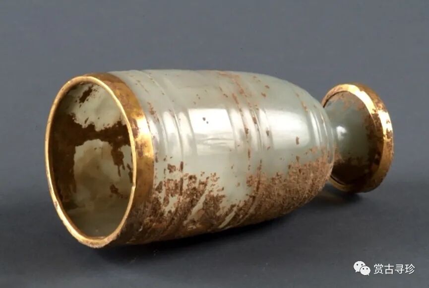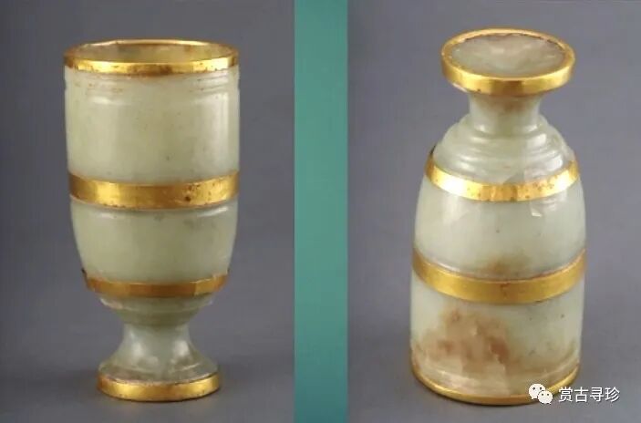 玉杯:(三件玉杯形制相同,通体打磨光润。玉杯直口圆筒形,喇叭形高足,杯身口部、腰部、腹部均刻宽双凹线夹宽凸线。玉质为和田青白玉。经仔细观察三件玉杯均有石绺,其身上的糖色为原生色而非后沁色。据推断杯身上的包金不仅起到美化作用,更是用来加固杯身,以免在使用过程中开裂。西汉后期,宣帝勤政中兴,但风雨飘摇的西汉王朝,此时与匈奴连年征战不断,至公元前51年(甘露三年),匈奴发生内乱,胡韩邪单于亲至五原塞上请求入朝称臣,才成了汉朝的藩属。其间通往西域的道路经常中断,致使新疆玉料在内地日渐稀少,从玉杯所用玉料可见当时和田青白玉的稀少和珍贵程度。此三件玉杯与1976年9月西安市长安县车刘村秦阿房宫遗址出土的秦代玉杯、河南省洛阳市文物工作队收藏的三国玉杯从造型看雷同,更接近三国玉杯,只是从纹饰上由繁变简,最后变光素的渐变过程。这些玉杯在制作工艺上有一定的连贯、延续性,三件玉杯从中起到承前启后的作用。同时玉杯的选料和工艺也符合当时汉宣帝勤俭治国的社会背景。这类玉杯虽然光素无纹,但其金镶玉的装饰技法显露出富丽堂皇的皇家气派,其使用功能可能和当时人们祈求长生不老的仙家思想有关。古人认为玉是山川之精华,食玉可以长生不老,据《汉书》等文献记载,此类玉杯的功能是承接露水,用以服食玉屑以求成仙。