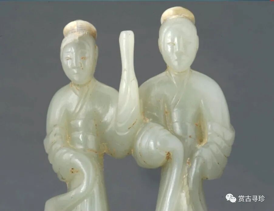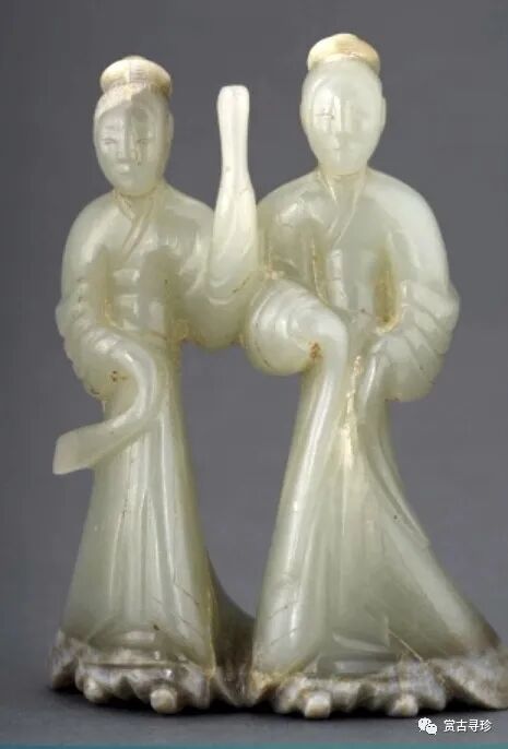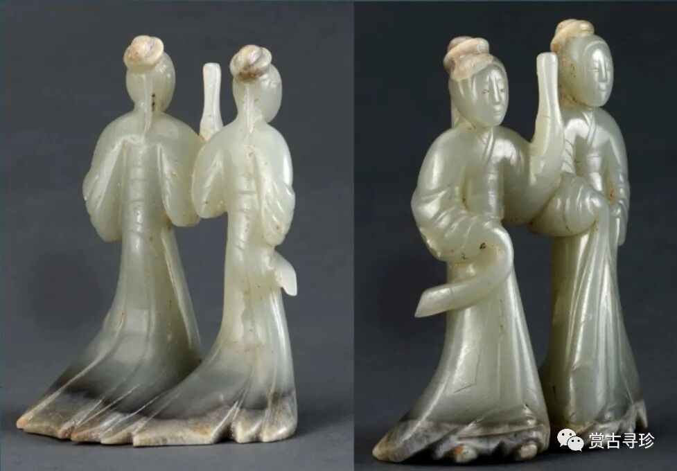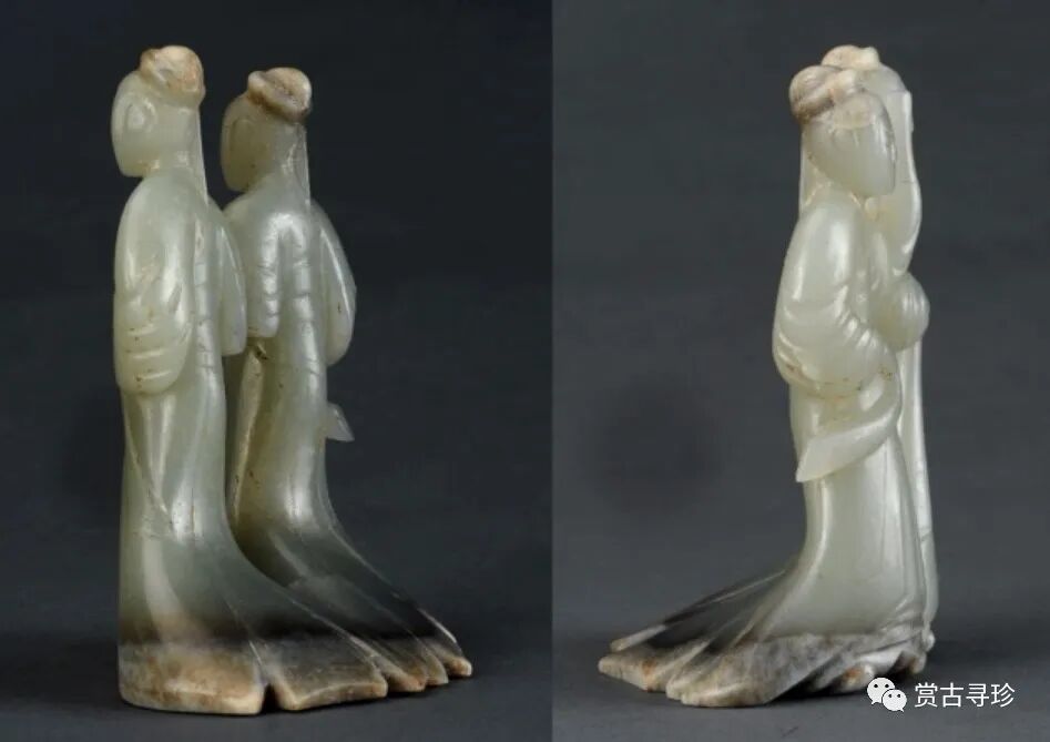 玉舞人 :通高10.2厘米,底边长8厘米。玉舞人采用圆雕技法,两人联袂并肩伫立,长裙拖地,实属罕见。玉质为和田青白玉。两舞人身材修长,发式、衣着、鞋履相同。鸭蛋形脸,宽眉细眼,嘴角露出恬淡的微笑,长发挽高髻盘于头顶,一缕发稍下垂于肩胛。削肩膀,身穿左衽交领长袖衣,腰间系带,下裳即通常所称的长裙,前襟下摆略短,露出圆头履,后襟长而拖于地。个矮舞女左臂向空中甩长袖,右臂向后甩长袖;个高舞女双臂扶腰,长袖下垂,随风而飘。玉舞人以粗阴刻线展现大形,以细阴刻线勾勒细部,细阴刻线采用游丝毛雕技法,以摆动的裙角,流露出舞蹈时衣摆自然飘扬的状貌,充满了舞蹈的动感,显得飘逸浪漫,引起观者无限的遐想。从舞女的着装和舞姿看,表演的是长袖舞。这种舞蹈在战国时期已经流行,表演时双袖旋转、翻飞、飘动,挥洒自如,舞姿婀娜优美。