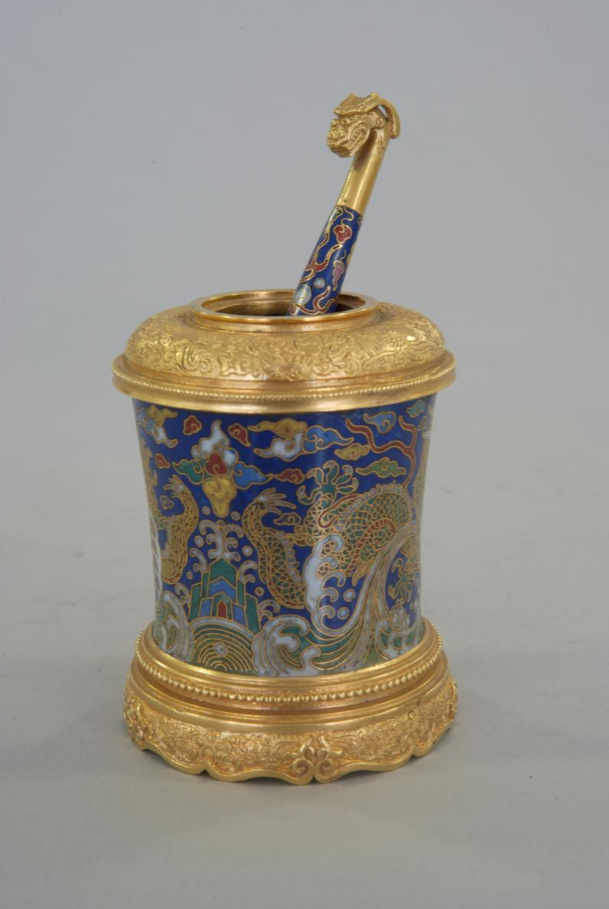 明代之后的清代皇帝,也十分重视景泰蓝这种工艺品的制作。清康熙年间,内务府开设“珐琅作”,乾隆年间,又在广州、扬州等地建立作坊,专门生产供皇家御用的景泰蓝。一时间,景泰蓝的发展出现了一个“黄金期”。