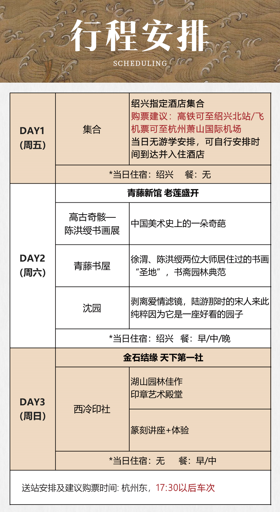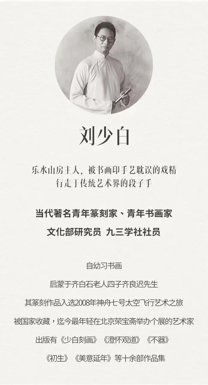 “高端的食材,就要用朴素的吃法,像我这样还有谁?”这些人物生动可爱,虽是古画,小表情倒是与今天的漫画颇有相似之处,一看就知道作者是个有趣的人。他,便是陈洪绶,号老莲,一位生于晚明的画家。后世评价“力量气局,超拔磊落,在仇(英)、唐(寅)之上,盖明三百年无此笔墨”。当时的人评价其风格“高古奇骇”,你看,他让古人都觉得,他是个古人。那个时候,画家大多都学习宋元时期的绘画,陈洪绶却主张师古要从晋唐开始。还是他的好友周亮工懂他,“人但讶其怪诞,不知其笔笔皆有来历”。剥去怪诞的第一感,其实陈洪绶所落的每一笔,都有来历。今年是陈洪绶逝世370周年,在他的故乡——绍兴,正举办“高古奇骇——陈洪绶书画作品展”。果然题眼正是:高古奇骸。“高古”是指从绘画本源上直追晋唐遗风,“奇骇”是指不同于世俗的奇特画风、立意不凡的艺术表达。“当代中国画野心如何?我们能不能从经典图式中寻求轮回转世,重新构架传统水墨的遗骸?或许像少白这样的艺术家可以在当今时代的洪流里逐渐给出一个答案。”哦,陈丹青眼中可以承载“中国画野心”的少白老师,看来同老莲一样:若由少白老师来导赏陈老莲的“高古奇骸”,应是一场绝妙而酣畅的隔空对饮吧。《高古奇骇——陈洪绶书画作品展》由绍兴博物馆携手国内35家文博单位共同举办,上一次如此规模的书画大展当属《畸人青藤——徐渭书画作品展》。奇骸&畸人,徐渭&陈洪绶:两位晚明时期个性张扬的绍兴人,都携奇气入书画,自成一派。“奇”,是他们人格乃至画格的公约数。公元1593年,疏狂不羁一生的明代书画家徐渭,在这里悄然逝去。公元1644年,一个45岁的中年男子,轻轻叩开尘封已久的书屋大门,这便是举家从诸暨搬迁至此的陈洪绶,与前屋主同样有着清癯高逸的灵魂,怀着对徐渭的敬仰,他亲手书写了匾额“青藤书屋”。而今的青藤书屋,参观的大多人只把其当做名人故居,却忽视了它本身就是一处意蕴悠远的园林。因为书画与园林,在东方语境中向来血脉相通,作为居住过两位书画大师的“圣地”,青藤书屋,自有不少角落留下大师营造之意趣,是现存不多的书斋园林之典范。而在青藤书屋不远处,还有一座同样被低估了“园林”身份的所在——沈园。抛开陆游、唐婉那凄美爱情故事的滤镜,回到当初还没有《钗头凤》之唱和的时候,陆游、唐婉来此春游可是纯粹因为这是个好看的园子呢。园林,作为诗意生活的寄托,大概是艺术与生活结合得最全面而彻底的实践了。难得的是,少白老师在苏州也给自己造了一方庭院,有松,有石,有水塘,无论春秋,盘桓一过,听曲、饮茶、闻香、看画、读书、游园,别有洞天。那么,便听听他,一位当代的“造园主”“生活家”,如何观园、享园。与之有异曲同工之妙的,便有这印章之上的方寸之间 气象万千;小小印章的方寸之地,融汇古往今来文字的流传演变,承载着中国传统的美学偏好和文人雅士的意趣情怀。诗、书、画、印常为一体,印是不仅仅是书画家的签名,还可以起着调节画面的作用,如补空、引气、平衡和协调画面。所幸,少白老师不仅精书画家,也是杰出的篆刻家,17岁时,便获齐良迟(齐白石老人第四子)赞曰“少白学白石老人篆刻可乱真也”。2008年其篆刻作品入选神舟七号太空飞行艺术之旅。那么此行:我们便由少白老师引路,走近这小中见大、缩龙成寸的艺术;同时还有机会,于名家指点下,亲自动手体验篆刻,用刀、石、笔三者完美融合“铭记这一刻”。11.25-27日,从绍兴到杭州,让我们跟随少白老师,掠过书画、金石、园林艺术的天空,来一场书画江南的秋日漫步。一趟书法、绘画、园林、金石四度同构的艺术之旅,“魂穿”一回中国古代文人