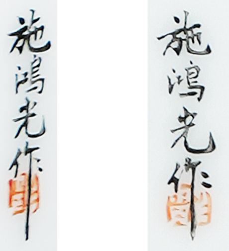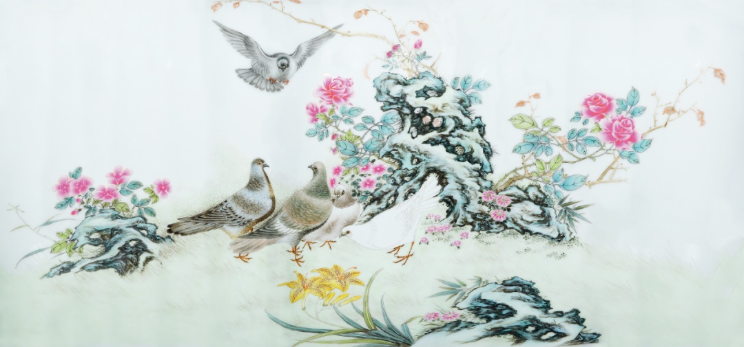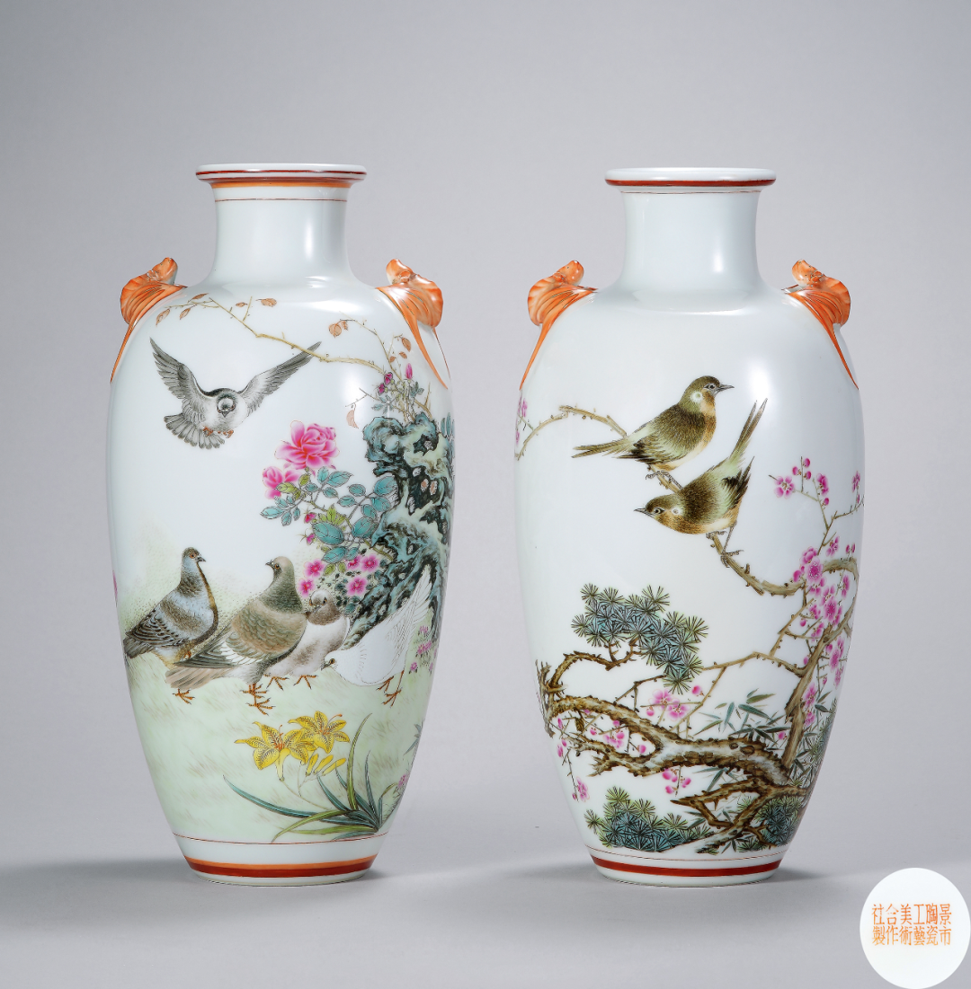 施鸿光,1959年第一批受誉陶瓷美术设计师,珠山八友何许人弟子,擅长花鸟。底款“景市陶瓷工艺美术合作社”,1952年成立,合并了景德镇第一,第三,第四工艺社及东风瓷厂的新彩部,陆续更名“景德镇陶瓷美术合作工厂”、“景德镇陶瓷工艺美术瓷厂”,1958年9月24日,“景德镇陶瓷工艺美术瓷厂”和“出口彩绘加工厂”联合组建“艺术瓷厂”。此件花鸟对瓶出自俄罗斯。其中一只瓶子绘制了松树、竹子、梅花和喜鹊。松竹梅“岁寒三友”代表顽强的生命力,比喻忠贞的友谊,二只喜鹊立于梅枝之上,寓意“喜上眉梢”好事连连。另一只瓶子上绘制了代表和平的鸽子,旁边绘制了萱草花,又称忘忧草,意在忘记忧伤和愁绪。中间粉色的月季花,则代表着希望和幸福。而上方几笔灿烂的红色枫叶代表了对往日的回忆。可送给一路陪伴的朋友。上世纪50年代正值建国初期,国家百废待兴,再看此对瓶子绘制画面的寓意,又用了当时极为昂贵的西德进口粉彩料,可推测此对瓶为当时抗美援朝胜利后,和前苏联交流难得的一对国之礼品瓷。