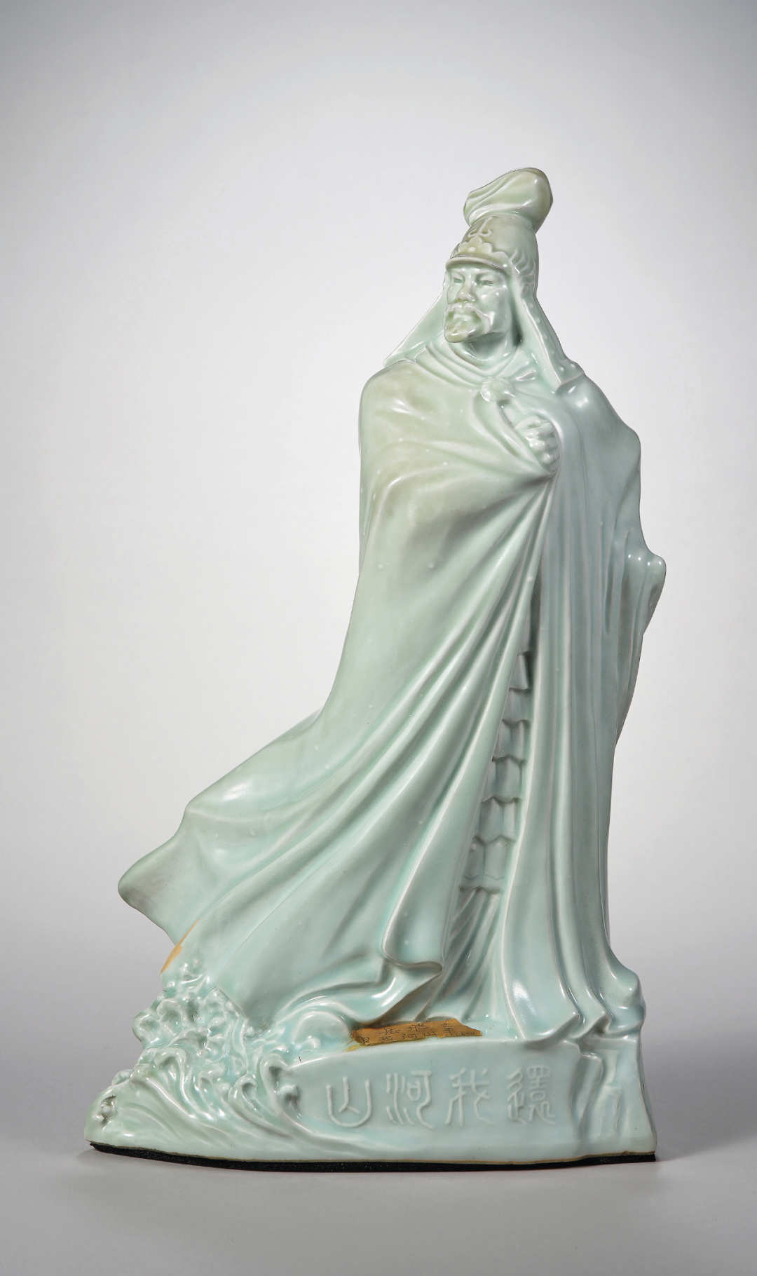 姚永康(1942-2017年),祖籍浙江宁波,出生于江西吉安,成长于南昌。1957年,15岁时拜国画大家胡献雅先生为师。1966年景德镇陶瓷学院美术系毕业,曾在江西瓷业公司美术室、建国瓷厂美术室、省市展览馆任美术师。1980年调回景德镇陶瓷学院,任教于景德镇陶瓷学院美术系雕塑专业,先后担任雕塑教研室副主任、主任。1996年任正教授,2005年离休。几十年来从事美术教育,坚持自己的艺术理念和艺术创作,为联合国国际陶艺协会会员(IAC会员)、中国美术家协会会员、中国美术家协会陶艺委员会委员、江西省雕塑艺委会主任、景德镇高岭陶艺协会会长、享受国务院政府特殊津贴专家、陶艺家、艺术教育家、中国当代著名雕塑家。1962年为纪念郑成功收复台湾三百周年,厦门建立了郑成功纪念馆作为对台交流的特别举措,对于两岸郑成功民俗文化的传播与交流颇为重视。在这样的背景影响下,景德镇陶瓷学院美术系雕塑专业毕业的姚永康于60年代末70年代初创作出了《郑成功》瓷雕系列作品。此件瓷雕就是其中的佳作,通体施高温影青色釉,釉水晶莹温润,胎骨厚重密实,线条流畅刚直有力,人物造型生动,开面细腻表情庄严,双眼炯炯有神,若有所思地凝望着大海远方,作品下方的海浪纹和篆书“还我河山”四字的细节刻画,更加体现出中华民族精神,彰显作者的爱国主义情怀。今年离建馆至今正好一个“甲子”,又是纪念郑成功收复台湾360年,两岸同胞,血浓于水,海峡同根,同祖公。郑成功民俗文化经久不衰、与时具进,成为两岸共同的精神支柱与情感纽带。同类题材作品刊载在2017年10月由景德镇陶瓷大学编,漓江出版社有限公司出版发行的《宛若天成——姚永康雕塑艺术》书籍中。郑成功(1624-1662年),字明俨、大木。福建泉州南安人,祖籍河南固始。汉族,明末清初军事家,抗清名将,民族英雄。因蒙隆武帝赐明朝国姓“朱”,赐名成功,世称“国姓爷”,又因蒙永历帝封延平王,称“郑延平”。1661年(清顺治十八年,南明永历十五年)3月,郑成功亲率2.5万名兵将,分乘百艘战船,从金门出发,越过台湾海峡,翌年击败荷兰东印度公司在台湾大员(今台湾台南市境内)的驻军,从荷兰侵略者手里收复了沦陷38年的中国领土台湾,开启郑氏在台湾的统治,以赤嵌城为东都,建立府县,编制军队,屯田垦荒,奖励移民,兴办学校,推进了台湾经济的发展。