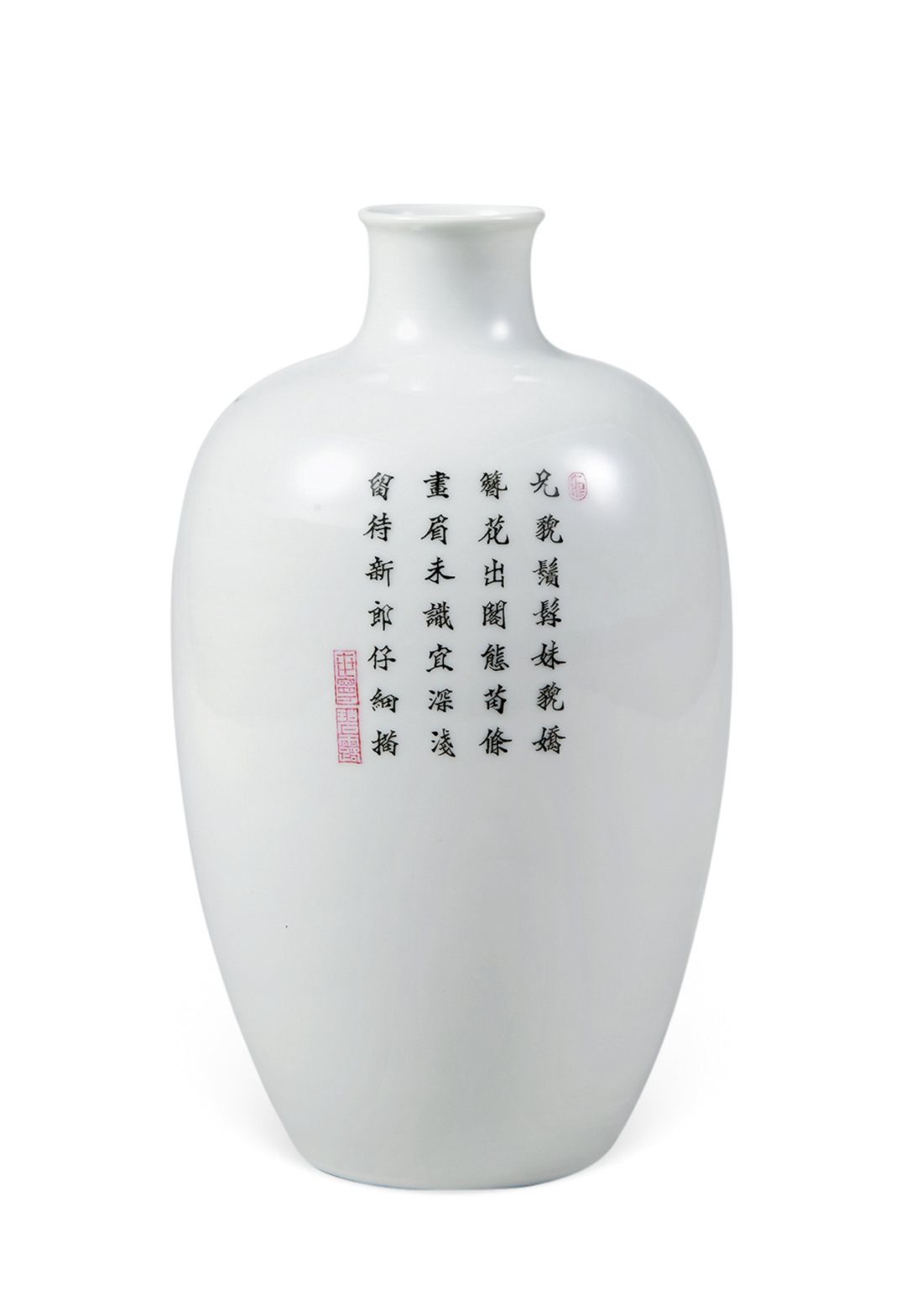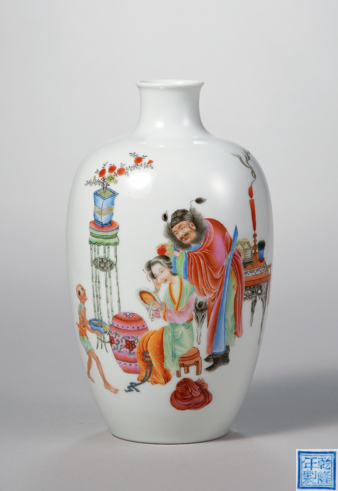 珐琅彩,瓷器装饰手法之一,源于画珐琅技法。使用珐琅彩装饰手法的瓷器,即珐琅彩瓷(正式名称为“瓷胎画珐琅”)也常简称为珐琅彩。珐琅彩是将画珐琅技法移植到瓷胎上的一种釉上彩装饰手法,珐琅彩始创于清代康熙晚期,至雍正时,珐琅彩得到进一步发展。以雍正、乾隆时期的产量最大,乾隆以后即少有制作。典型雍正、乾隆时期的珐琅彩瓷器是诗、书、画、印相结合的艺术珍品,是中国古代彩瓷工艺臻达顶峰时期的产物。此件作品是民国时期仿乾隆年间珐琅彩瓷器的标杆之作,极其难得。钟馗嫁妹是我国流传已久的民间传说故事,讲的是钟馗有个同乡好友杜平,为人乐善好施,馈赠银两助钟馗赴试。钟馗因面貌丑陋而被皇帝免去状元,一怒之下,撞阶而死。跟他一同应试的杜平便将其隆重安葬。钟馗做鬼王以后,为报答杜平生前的恩义,遂亲率鬼卒于除夕时返家,将妹妹嫁给了杜平。由于钟馗自古被誉为禳灾祛魅的神人,古今画家都喜欢以钟馗入画,除了喜欢画他捉鬼,也喜欢画钟馗嫁妹的故事,并留下了很多佳作。瓷器绘画也常见此题材,此件民国时期珐琅彩作品既是此类题材瓷器绘画的典范。此梅瓶胎质细腻洁白,釉面莹润。绘画衣纹流畅、设色艳丽,描绘了钟馗嫁妹前替妹妹梳妆的喜庆场面。钟馗粗旷的外表之下,一颗细腻的内心表现得惟妙惟肖,精神世界极其丰富。钟妹妹一脸的娇羞、中国古典美人形象跃然瓷上。一旁服侍的小鬼毕恭毕敬、诚惶诚恐的表情也是俏皮至极。