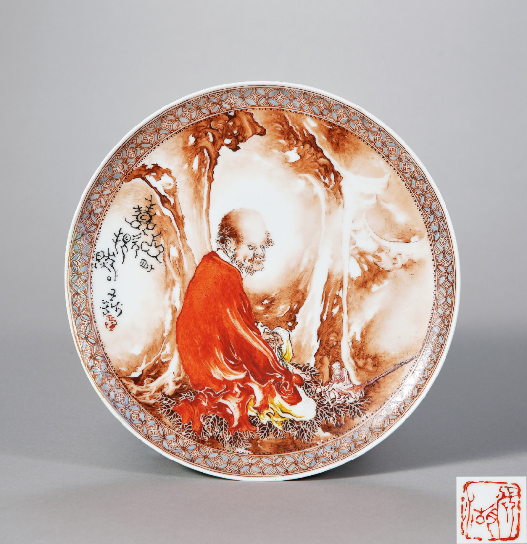 王步(1898-1968年),字仁元,号竹溪,晚年所作青花瓷及中国画常署“陶青老人”,江西丰城县人,尤精于青花,享有“青花大王”之称。1937年,抗日战争爆发,直至解放前夕,瓷业萧条,青花瓷器产量尤少,王步只能终止探索,改弦易辙,舍青花而从事釉上粉彩装饰,这一期间的彩绘多作矾红人物、山水、粉彩丛菊。此盘主题画面一尊红衣罗汉坐于枝叶之上,表情夸张,正在参禅悟道,背景变化丰富,如梦似幻。人物采用传统国画技法“没骨画法”,技巧纯熟。“没骨画”是中国画的一种画法。在中国书法里把笔锋所过之处称为“骨”,其余部分称为“肉”,不用勾轮廓,不要打底稿,更不能放底样拓描。作画时,要求画者胸有成竹,一气呵成。没骨画法要求绘者有顶级的造型能力和对颜色明暗阴阳变化的娴熟把握,非大师不能为也。此件赏盘是王步先生1937年以后没骨矾红罗汉的代表作品,极其难得,馆藏级作品。