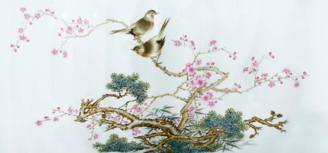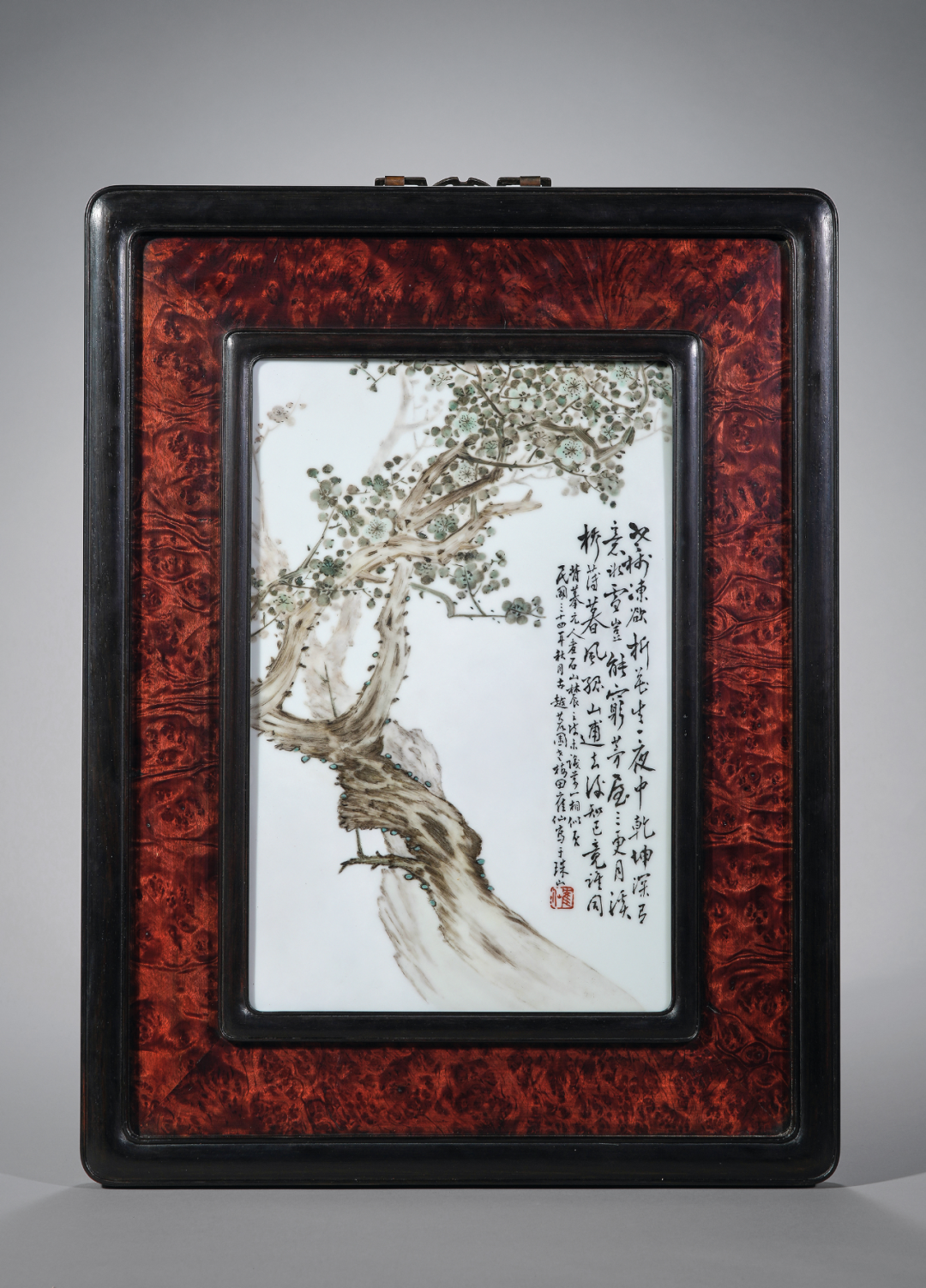 款识:“老树冻欲折,花生一夜中。乾坤深有意,冰雪岂能穷。茅屋三更月,溪桥薄春风。孤山逋去后,知己竟谁同。背摹元人煮石农之法,未识万一相似否。民国三十四年(1945年)秋月,古越荒园老梅田鹤仙写于珠山。”田鹤仙(1894-1952),珠山八友之一,原名田世青,号梅花主人,荒园老梅,书斋号古石斋,浙江绍兴人。田氏先师承施雪江画青绿山水,后主攻画梅,画法追摹元代画家王冕,梅花作品注重梅花树干的布局设色,明暗渲染,主树干色泽凝重,瘦傲天然,另虚画一杆,颜色淡雅涂之,略见树影,营造出实虚相生,梅花弄影的艺术效果。构图采用对角线平分的章法,梅花占驻左边,另一边以潇洒俊逸的长题诗文题款,钤印,巧妙地使画面达到平衡,将瓷画作品演绎到与元代大画家王冕书画作品极为相似的程度,成就斐然。珠山八友中的王大凡先生有七言诗句赞美田鹤仙的瓷画艺术成就:“壮年负笈入昌江,得识吾侪便转舱。山水清晖成一格,画出梅花更无双”。
