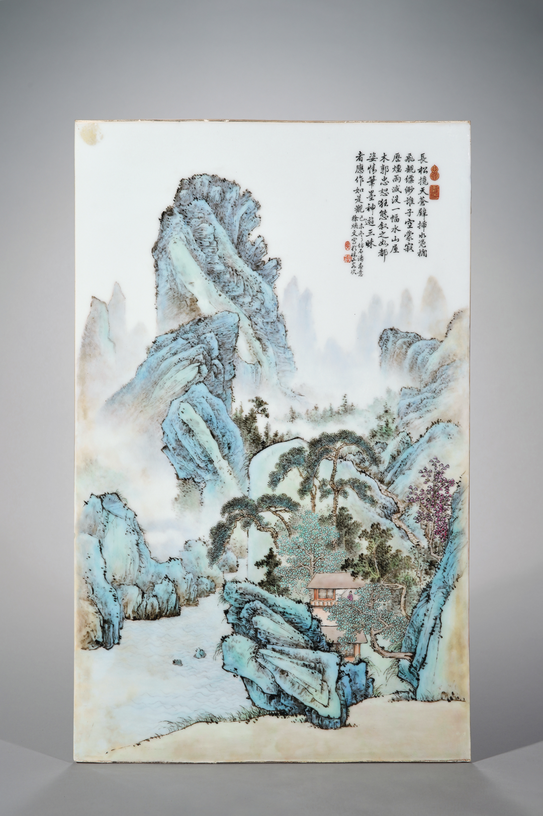 徐焕文(1932-),现当代绘瓷名家,曾任景德镇艺术瓷厂美研所副所长,擅长粉彩山水,师从珠山八友之子汪少平,并吸收石涛的笔法和黄宾虹的意境,作品意境高远。此板绘粉彩山水,气势宏伟,笔法妙丽,不落俗套。山石陡峻,画法采用了经典斧劈皴,凸显坚实的质感,体块感强烈,树木苍翠挺拔,在微澜的湖水映衬下更加葱郁。密林深处人家,高士洞观天下,整幅作品意境悠远,气韵天生。背板加盖“中国景德镇制”和毛笔书写“美”字,证明为徐焕文大师于1979年在景德镇艺术瓷厂美研所任副所长时之大作。
