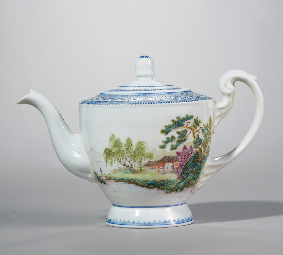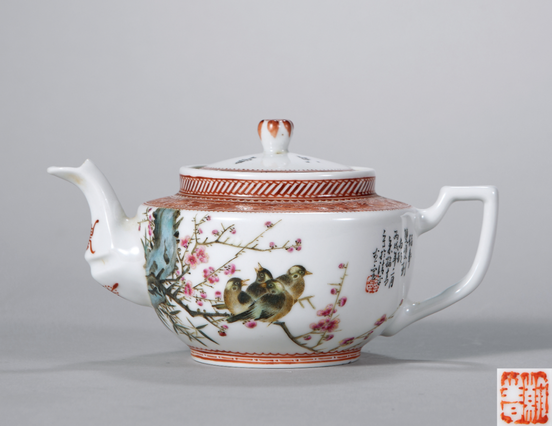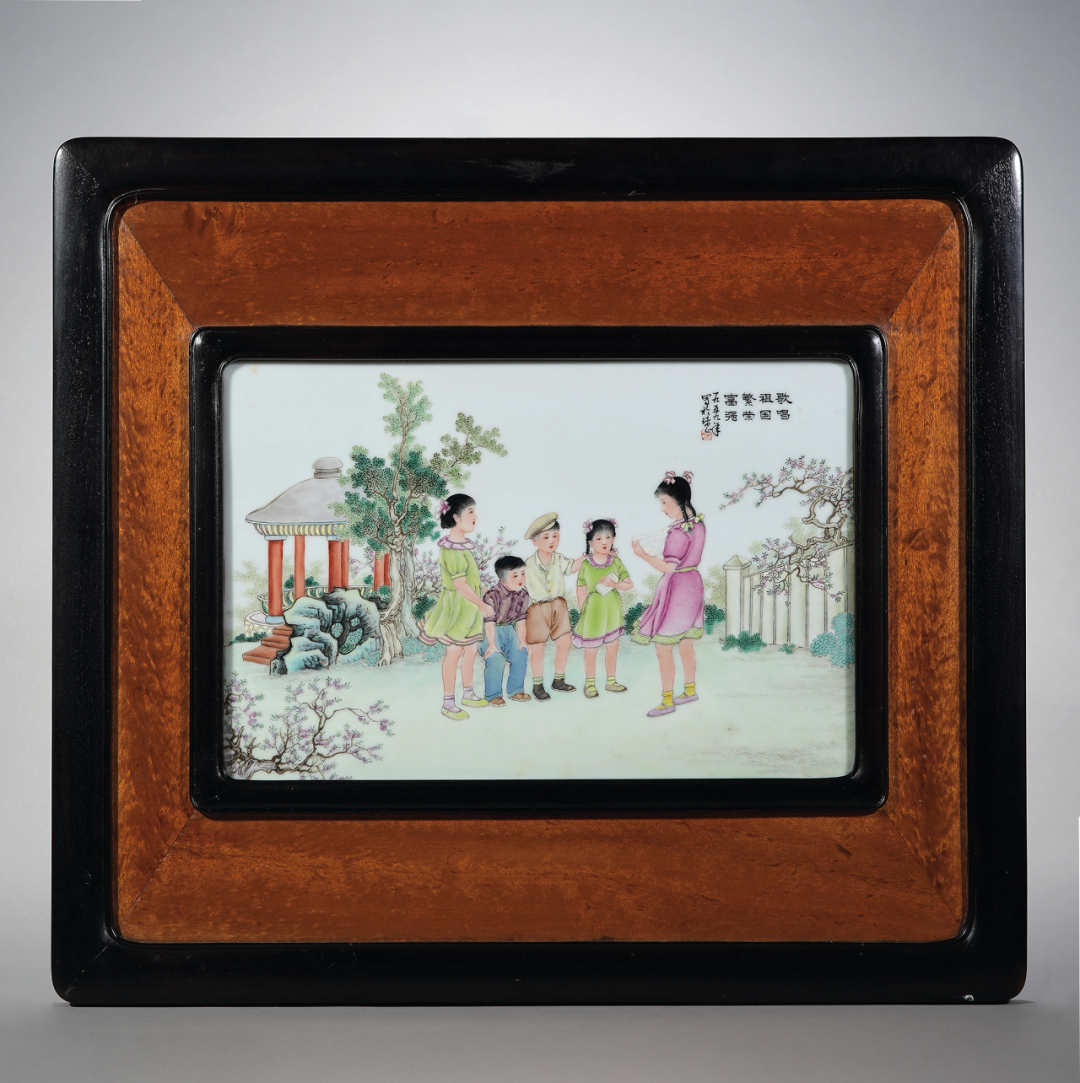 款识:“1956年国庆节慧菴素珍结婚十二载纪念”、“竹露松风焦烟雨”余达(1904-1987),字翰青,江西乐平人。别号爱墨山人、传芳居士,又号清平画室主人,晚年署拙翁。他自幼功读诗书,喜爱画鸦。因家贫来景德镇从事陶瓷美术研究。专攻花卉、翎毛、鱼虫、瓜果,兼画山水、人物、博古、走兽。他不仅对于诗文、书法、金石悉心研究,能融诗、书、画、印为一体,在纸上作画风格独特,求者盈门;更能在陶瓷上自画、自填、自理图案边脚,自题自书,独立完成一件完整的陶瓷美术作品。这在分工细致的景德镇陶瓷界尤其难能可贵,也成就了他不趋炎附势、我行我素的清高秉性。余翰青博深的造诣与“珠山八友”齐名,而与这些名家不同的是,他还具有较深的文化功底和传授技巧,这也使他成为景德镇陶瓷学院初创人之一,并且是五六十年代仅有的几位副教授之一。他1959年被景德镇市政府首批授予“陶瓷美术家”称号。曾为中国美术家协会会员、省、市文联委员、景德镇书画院顾问、市文物管理局鉴定委员。
