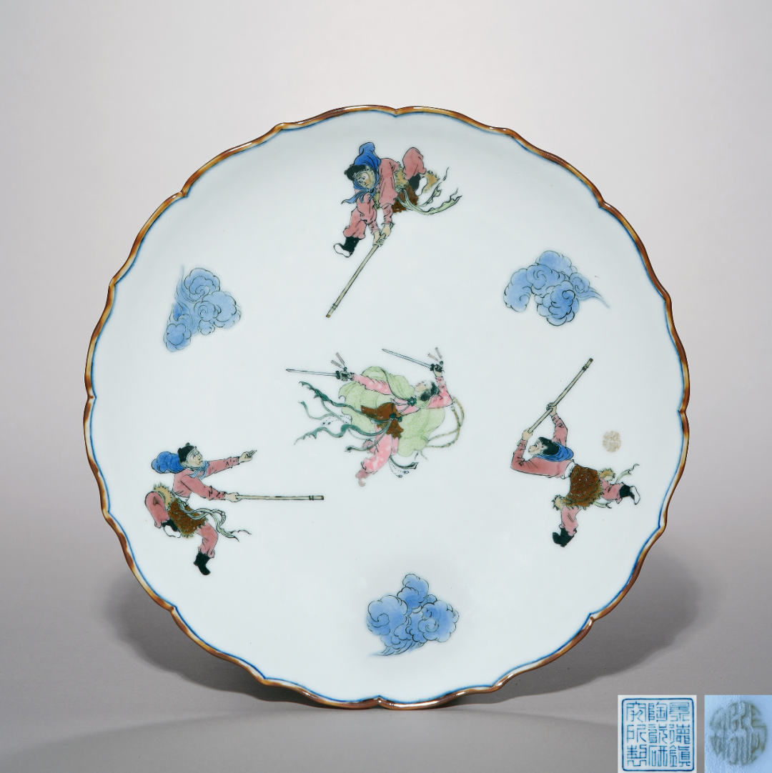 此件盘子,盘面印章为钟鼎文釉中彩“张松茂印”,盘子所用泥料为湖南醴陵之大球泥。制作极为讲究。葵边、沿口绘制青花加乌金釉,底足绘制青花,上下呼应。盘内绘釉中彩人物故事,烧制温度在1360度左右,所以成品率极低。此盘人物线条和彩的表现接近完美,画面人物阳刚和阴柔的对比表达,三个孙悟空用三个不同体态出现,足见张松茂大师之功力。底款为难得一见,方章里用官阁体釉中彩书写“景德镇陶瓷研究所制”,难得一见。张松茂(1934-),号芝山松茂,室名雅月斋。江西鄱阳人,出生于景德镇。中国工艺美术大师。其功底深厚,成就极大,是我国享誉世界的陶瓷美术全能大师。于轻工业部陶瓷工业科学研究所艺术室,专职从事陶瓷美术创作和研究。1959年由景德镇市人民政府首批授予陶瓷美术家称号。1988年4月,被轻工业部授予中国工艺美术大师称号,系中国美术家协会会员、中国陶瓷美术学会理事、景德镇市文学艺术界联合会副主席、江西省第七届政协委员,曾任景德镇市政协第二、第四、第五、第六、第七、第八届委员。享受国务院颁发的“政府特殊津贴”。
