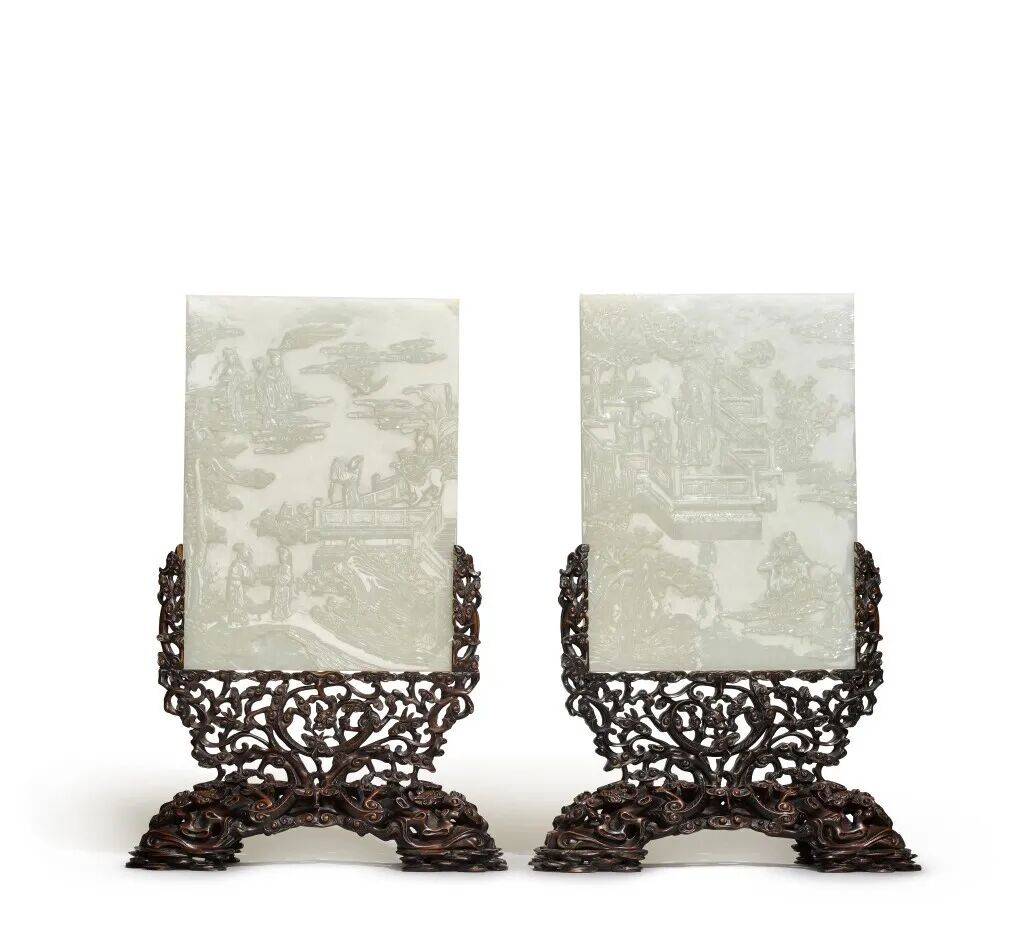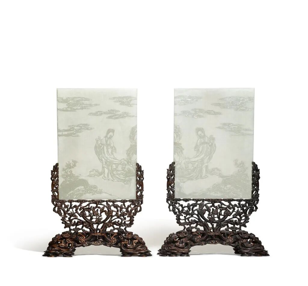 |清十九世纪末 白玉群仙祝寿图插屏一对|