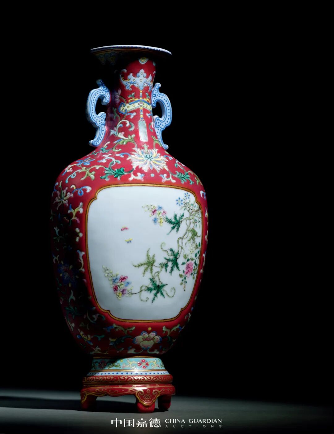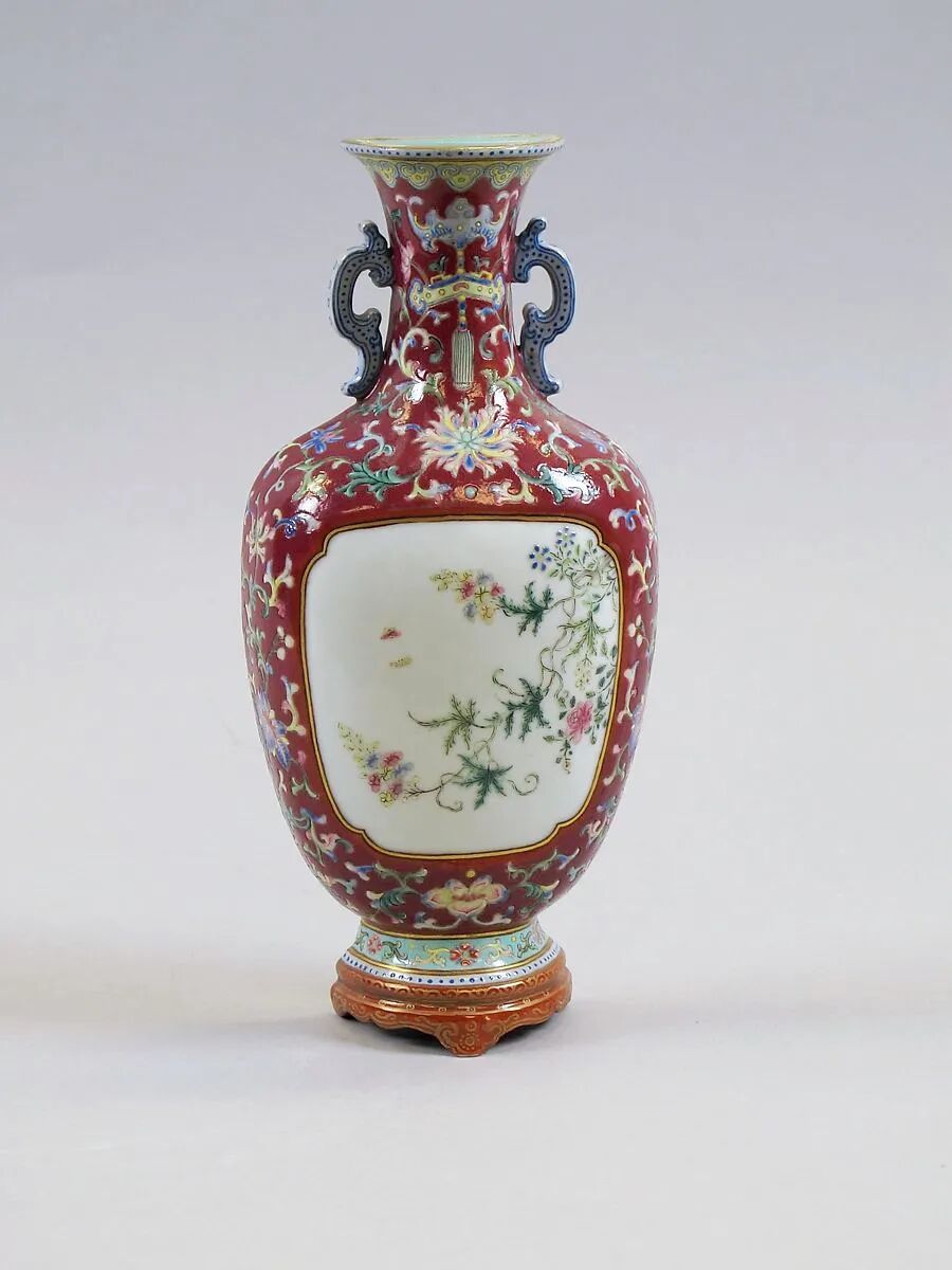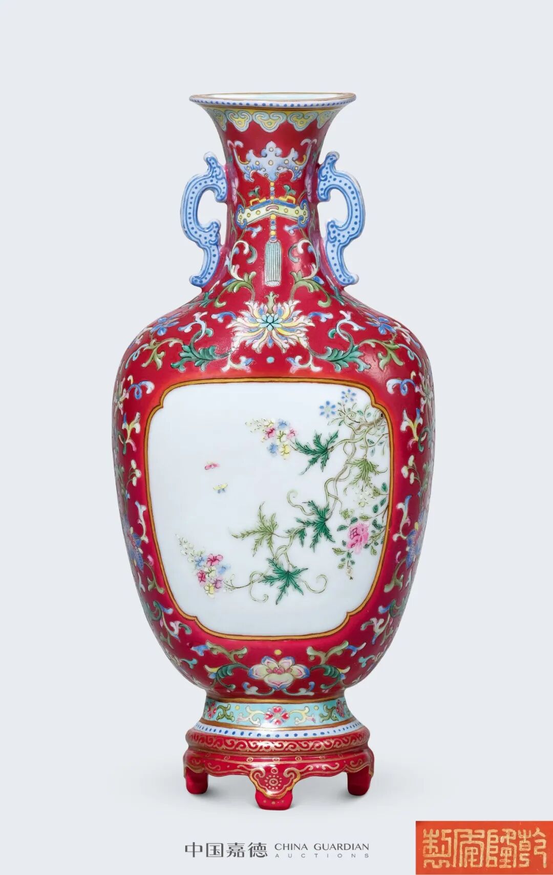 壁瓶侈口,长束颈,颈部对称置蓝彩螭耳,弧腹,足墙外撇,下承如意足座。口沿绘蓝彩圆点纹及黄地粉彩如意头纹。颈、腹部皆以胭脂红为地,颈部以洋彩绘祥蝠,下衔宝磬,下接西番莲纹。“蝠”与“福”,“磬”与“庆”同音,蝠衔磬寓意福庆绵长。腹部开光内绘洋彩花卉纹,花卉腻粉嫣红,枝叶翠绿清雅,蝴蝶轻飞,开光外绘缠枝莲纹。胫部绘松石绿地缠枝莲纹。下连仿生如意足座绘珊瑚红描金卷草纹。外底施珊瑚红釉,以金彩书“乾隆年制”四字单行篆书款。通体纹饰勾描细腻,设色丰富,填彩精准而富有层次感,虽繁复华丽,但布局井然有序,繁而不乱,可谓极尽御窑瓷绘之能事。