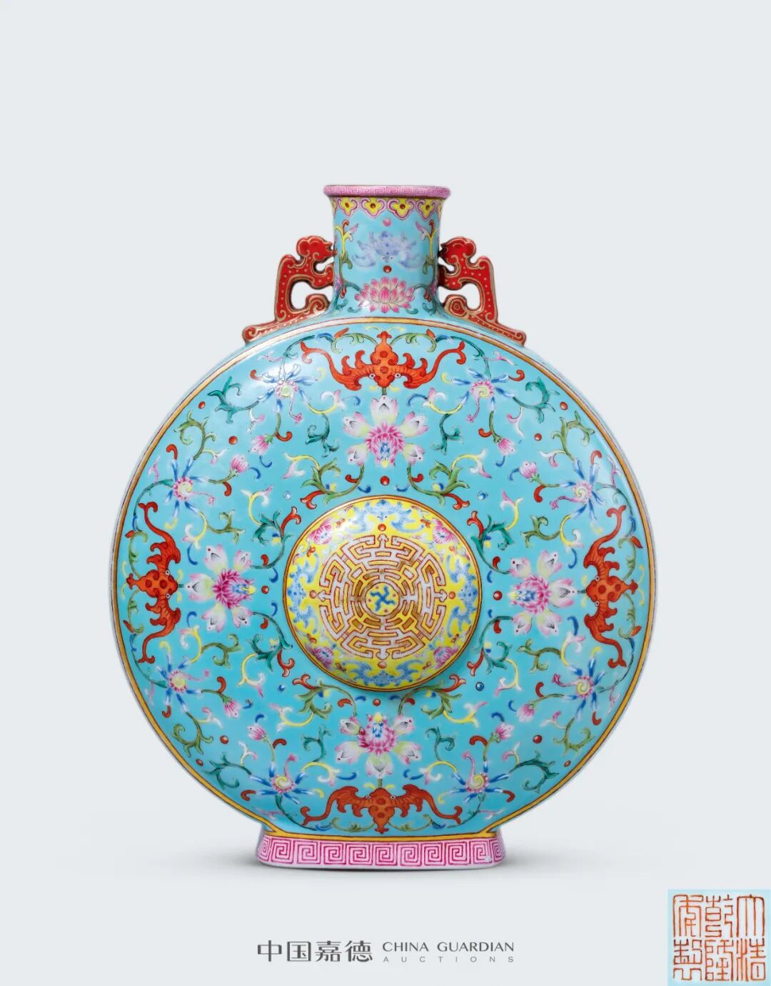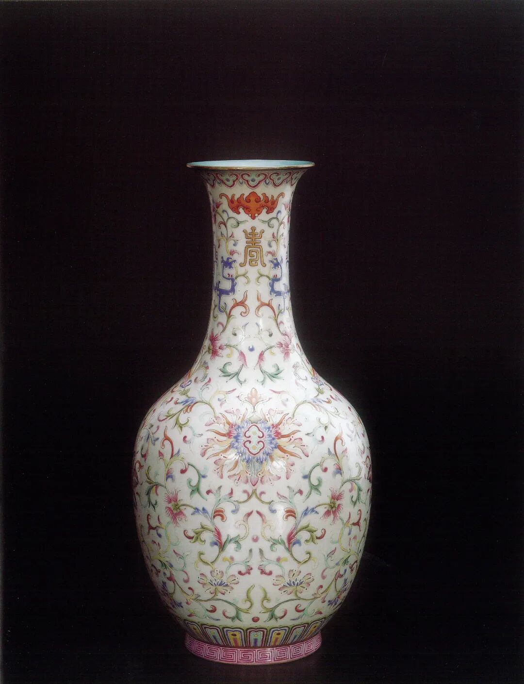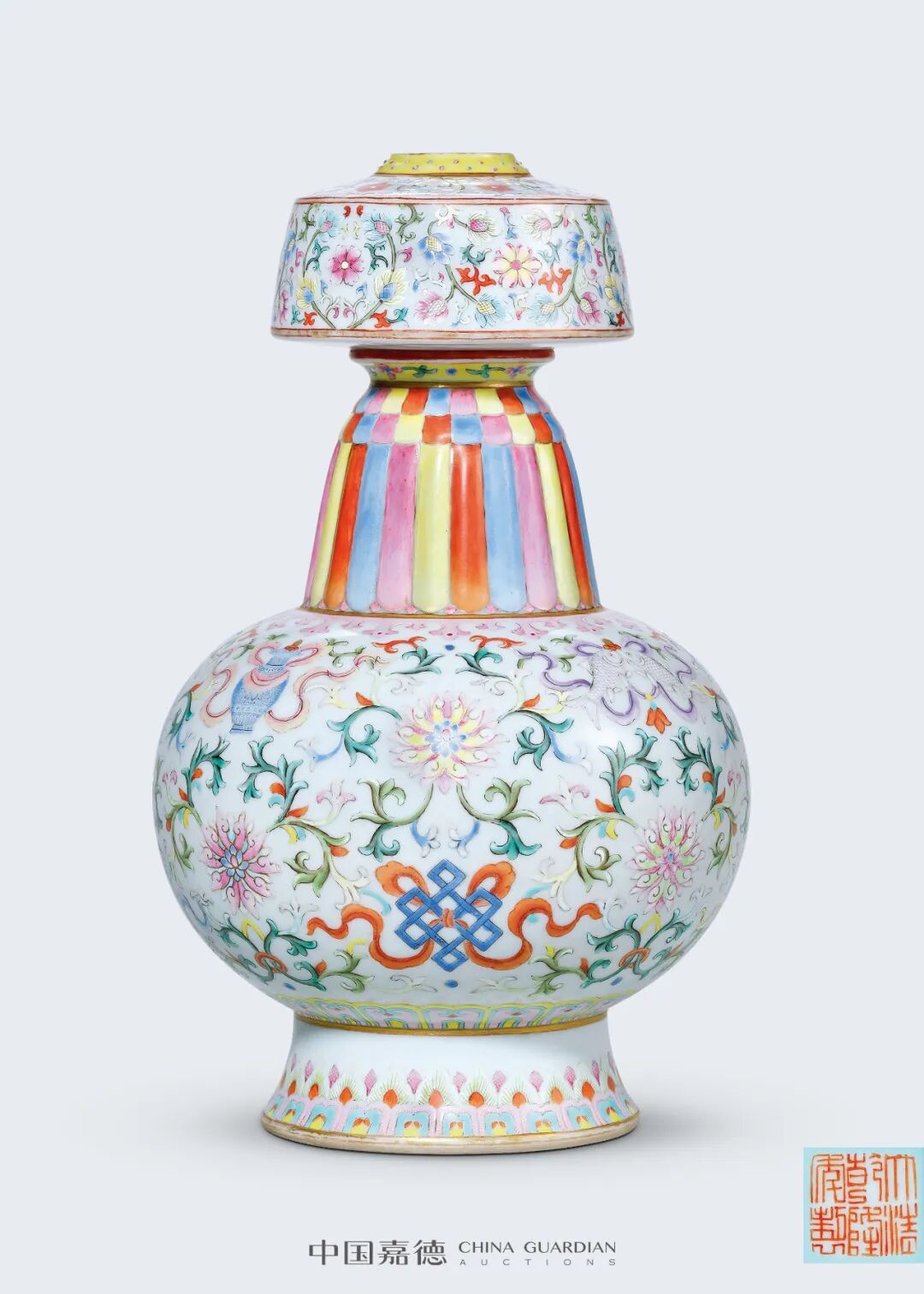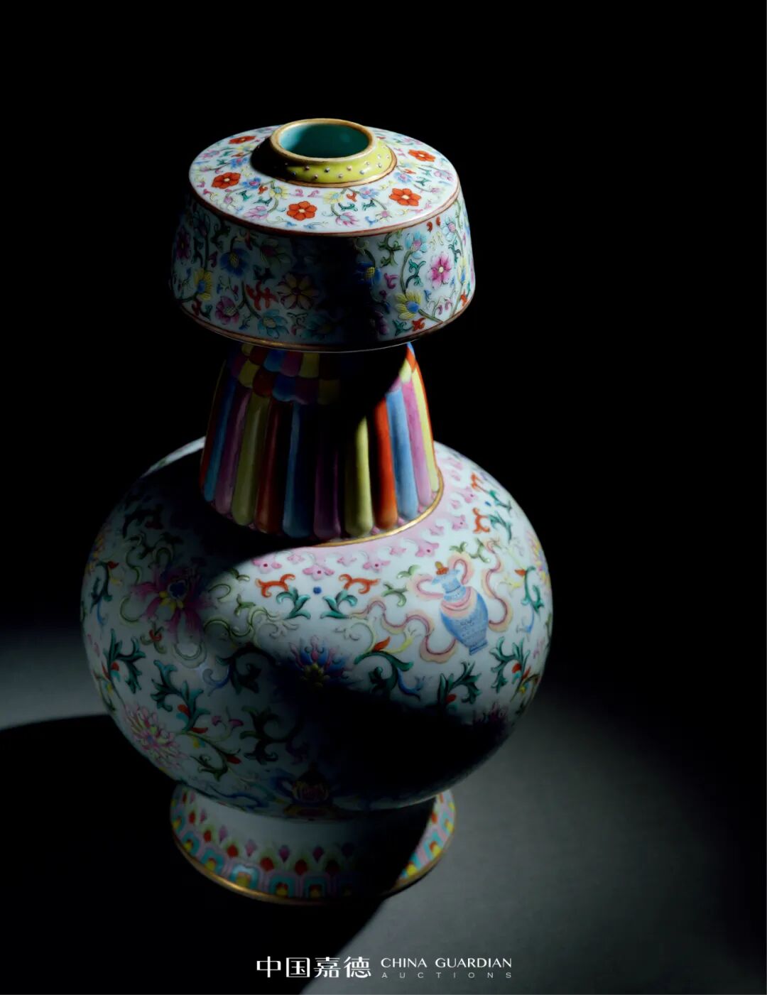 本品尊贵秀雅,纹饰细腻精美,寓意吉祥,布局繁而不乱,洋彩厚润匀净,花卉柔美舒雅,诸彩妍丽而含蓄,一展斑斓绚丽,繁缛奢华之美。