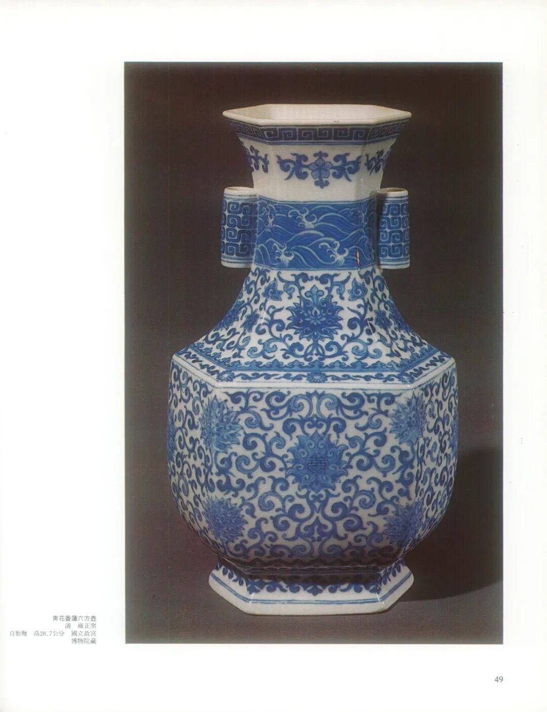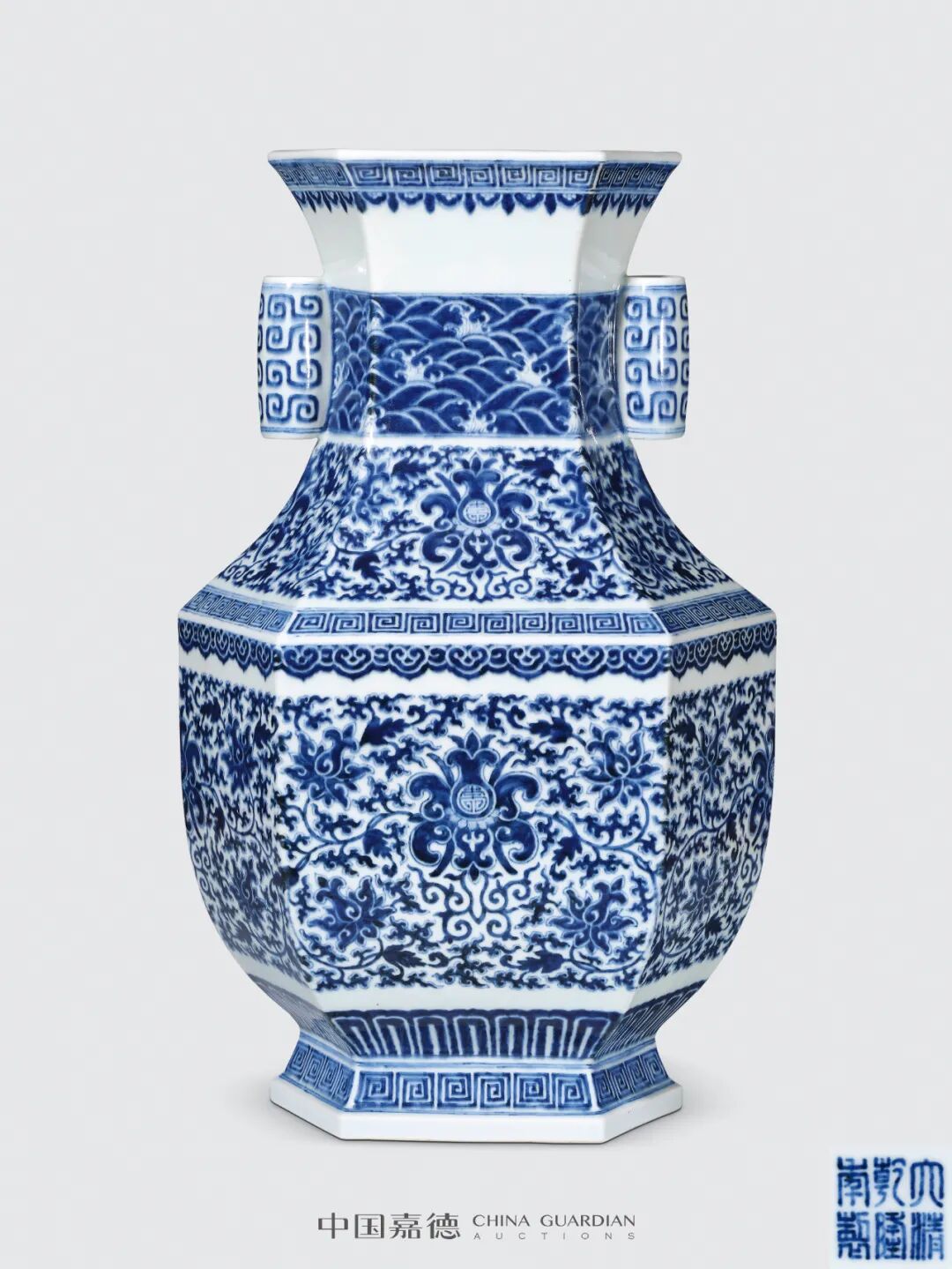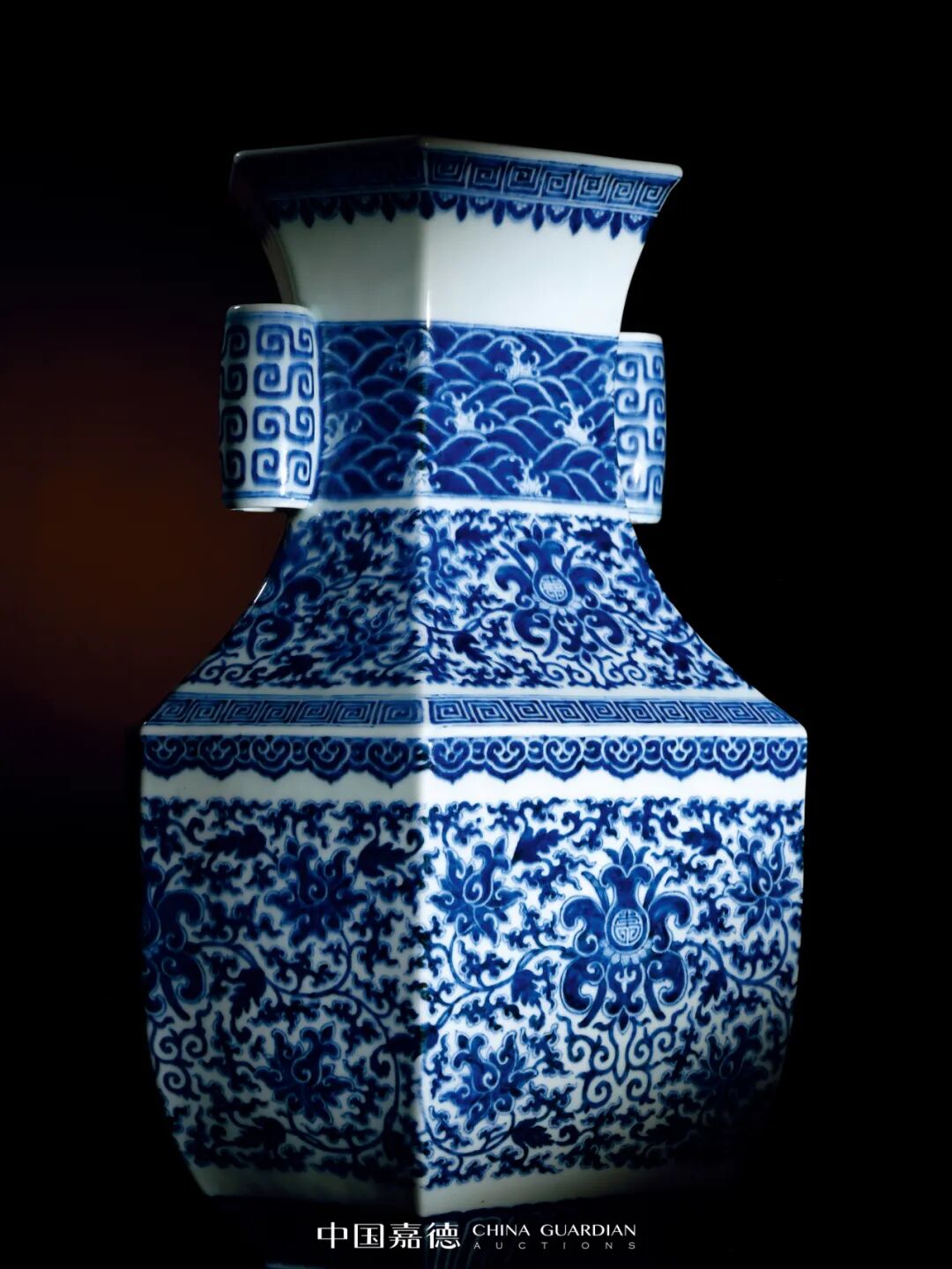 六方贯耳瓶为清代官窑经典陈设器,始于雍正,盛于乾隆,其造型由来可上溯三代青铜器,取其高古典雅之态。清代宫廷以仿古为尚,御窑瓷器常以内府所藏鼎彝为范。据《陈设档》中有记载乾隆四十二年(1777年)中行宫大殿陈设“乾隆款青花白地磁双管六方瓶一件”,可见此种六方瓶式样在清宫之制用。