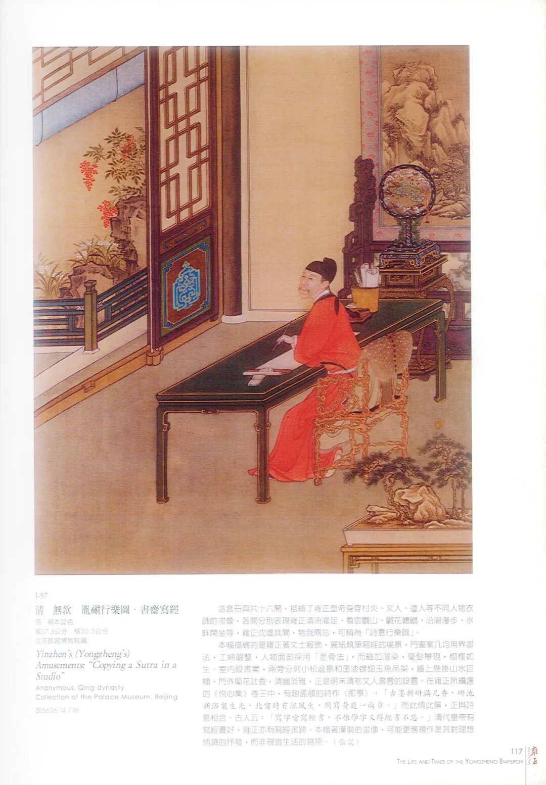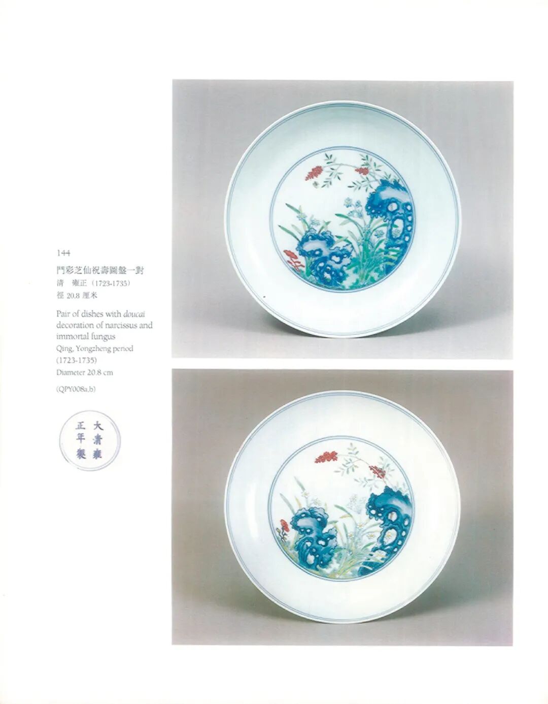 “灵仙祝寿”是雍正御窑斗彩瓷器名贵品种,雍正帝对此种纹样颇为珍视。从故宫博物院藏《胤禛行乐图·书斋写经》册页局部图中可见端倪。画中雍正皇帝着汉服闲坐书斋,展纸写经,其门外正是天竺、水仙与迭石,布局与色彩和本品主题纹饰非常相似,可以推知本品所依粉本或即源于此处。可以想象当年雍正皇帝对门前此番赏心悦目的景致是何等喜欢,以致让宫廷画师照此设计图样,交由御窑厂的画工临摹于瓷盘之中。同类作品于台北故宫博物院、徐氏艺术馆等见有收藏,可互为比较参照。