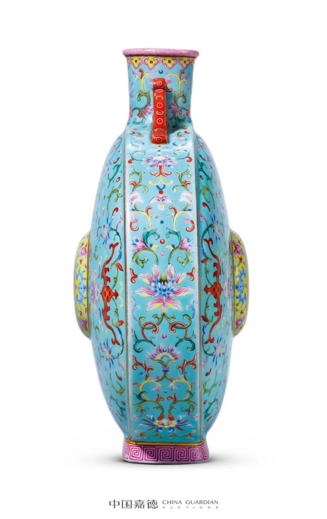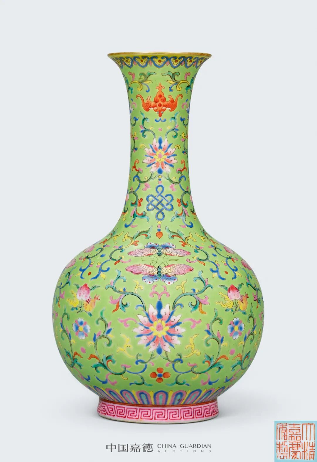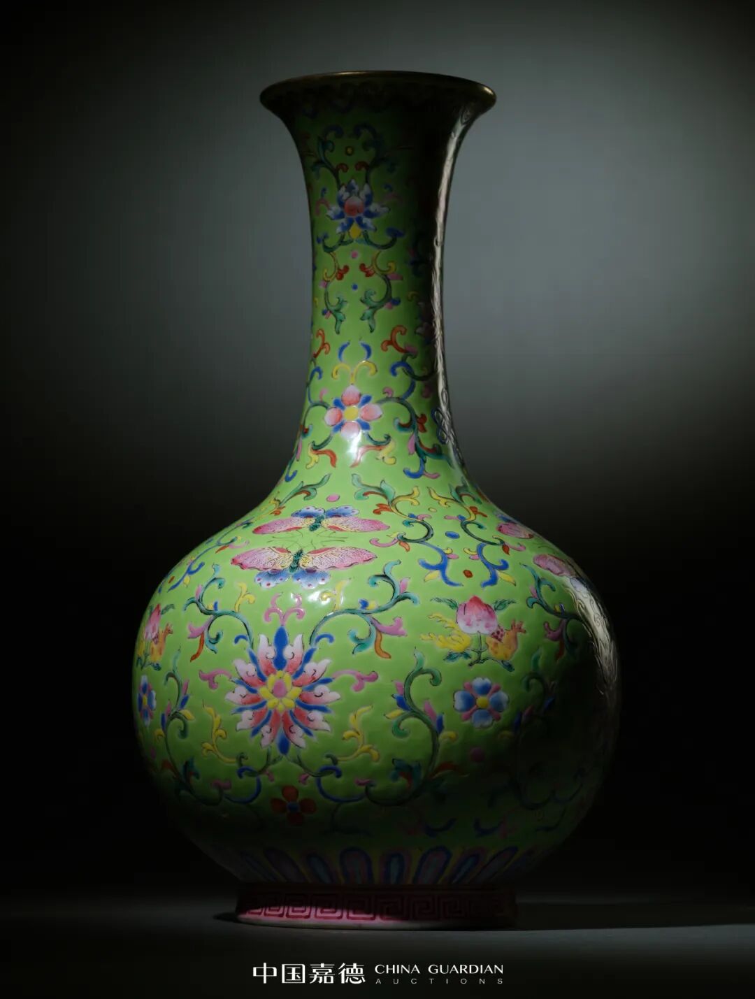 此外查阅公私收藏资料可以发现,目前所见的嘉庆色地洋彩器,绿地作品数量尤多,说明此种颜色颇受嘉庆皇帝喜爱。此器尊贵秀挺,装饰雍容华丽,纹饰布局繁密,图案化的装饰,尽展乾隆时期瓷器奢华的艺术遗风,为嘉庆洋彩器上乘之作。
