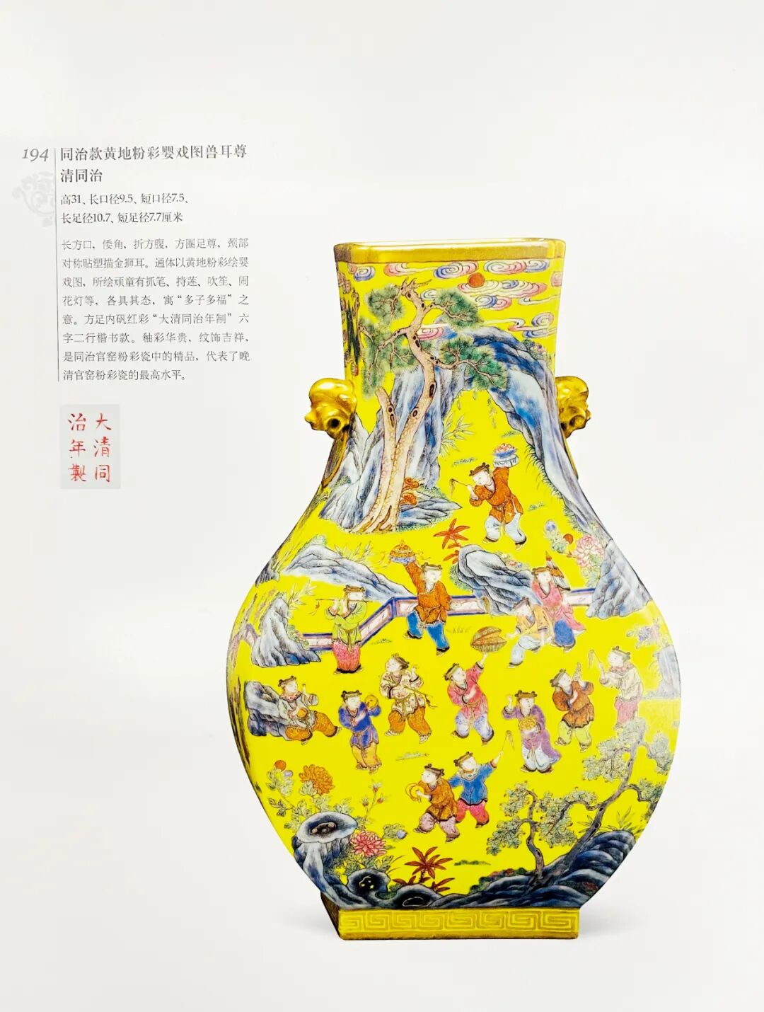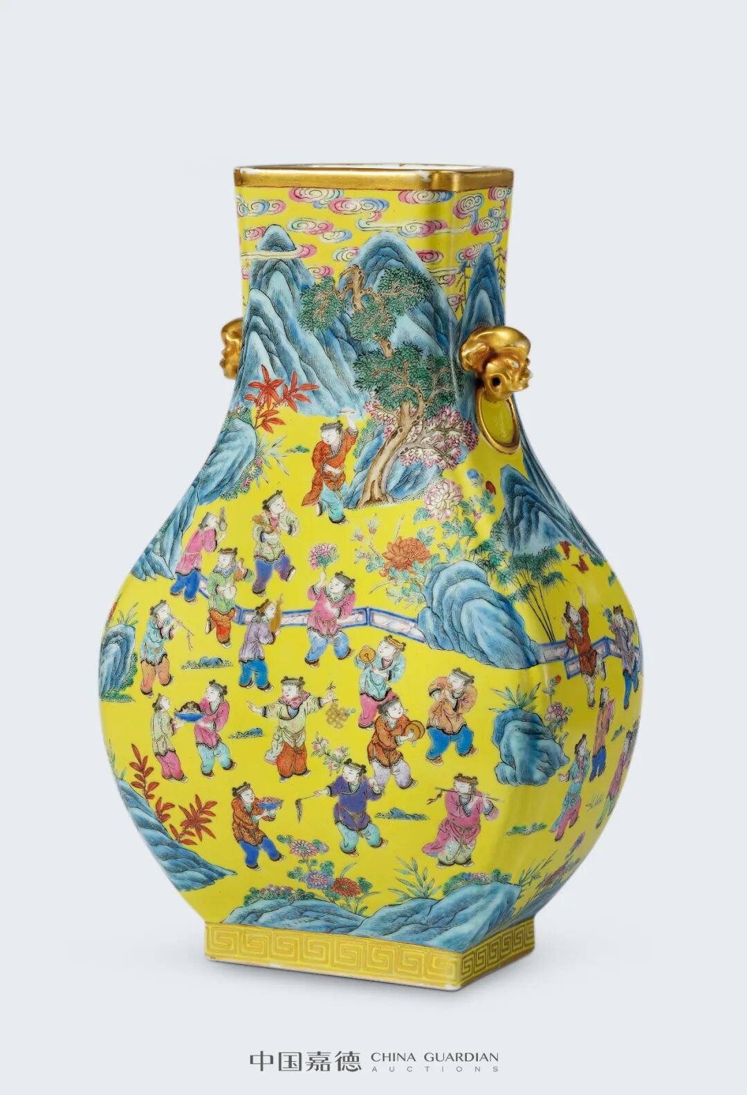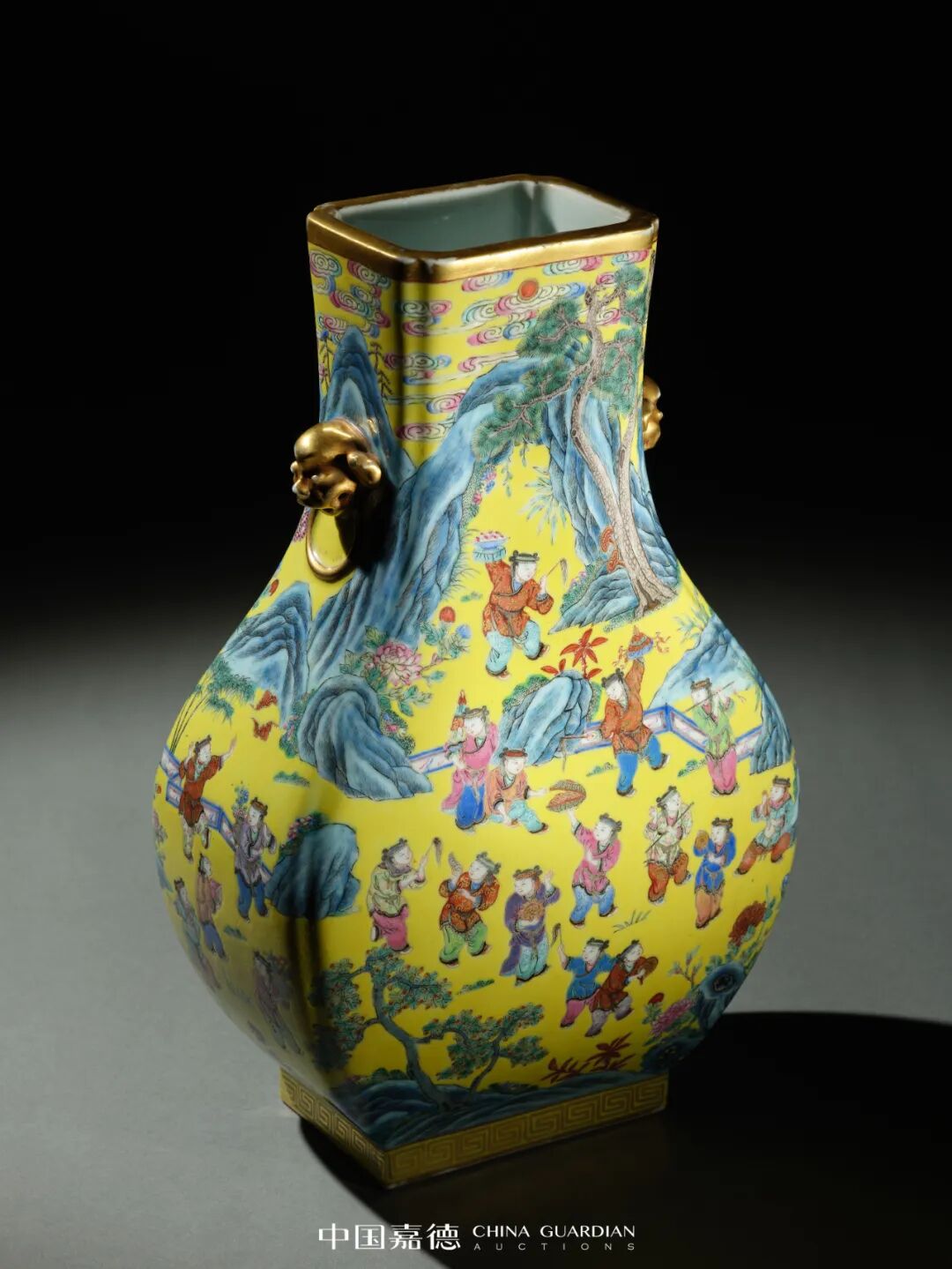 本品四方倭角直口,颈部微束,两侧置描金衔环狮耳,弧腹及底内收,下承圈足。从其造型不难看出,其当由贯耳方瓶化裁而来。瓶通体纹饰以黄地粉彩通景描绘婴戏图。画面中五色祥云飘逸,庭院内草木华滋,松石相伴而生,众童子或吹笛、箫、唢呐、笙,或敲锣、快板,或捧八吉祥,执寿桃、牡丹、如意、笔、银锭等,欢乐嬉戏,姿态各异,好不热闹。整幅画面构图饱满,设色华丽,人物描绘生动,尤其以黄釉打底更显堂皇富丽之感,描金装饰更添华贵气质,颇富宫廷审美气息。![]()