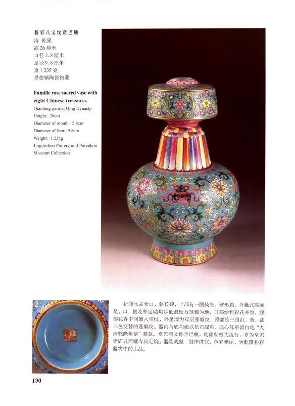 瓶洗口,束颈,球形腹,高足外撇,腹上以洋彩绘莲托八宝纹,八宝亦称“八吉祥”,是清代瓷器装饰中常用的宗教纹样,由法螺、法轮、宝伞、白盖、莲花、宝瓶、金鱼、盘长八种吉祥宝物组成。