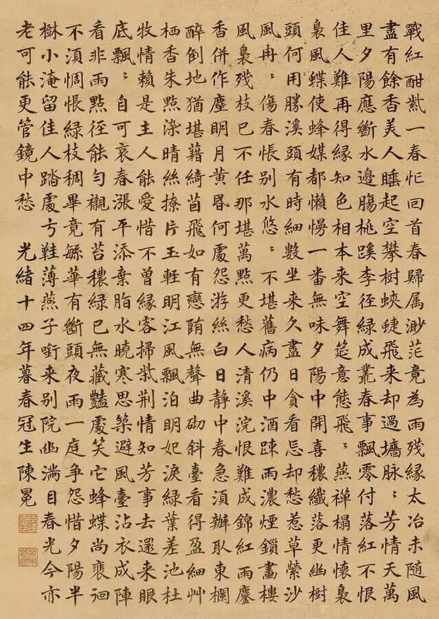 光绪,是清德宗爱新觉罗·载湉的年号,应用时间34年。在这不短的日子里,共出现了13位状元,光绪皇帝也亲眼见证和终结了这一被应用了一千多年的选拔人才制度。虽说当时科举制度已渐渐不适应形式,但选拔出来的个个都是文化修养极高的人才。单单他们的楷书,就羞煞了多少今天的“书法大师”!曹鸿勋,1876年中状元。曹长于书法,攻欧阳询《九成宫醴泉铭》。王仁堪,1877年状元。他品学俱优,能为百姓做好事。他擅长书法,骨气劲峭,广受赞誉。黄思永,字慎之,生于1842年,1880年状元。因做实业有成绩,被时人称为“实业状元”。黄思永书法雄劲多姿,气势逼人。以现在老百姓的审美眼光看,似乎也很少有所谓“书法家”能达到这个水平!陈冕(1859年—1893年),字冠生。1883年,24岁的陈冕参加殿试,一举夺魁,成为状元。网友叹:今天许多书法家看了,应该也会“无地自容”!赵以炯,字仲莹, 29岁中状元,成为云贵千年科举以来“以状元夺魁天下”第一人。吴鲁,字肃堂,号且园,泉州历史上最后一位状元。吴鲁能书善画,文从沈梦了解,吴鲁书法远宗颜柳,近宋四家苏米,温文雅致,沉雄峻拔,堪称大家。刘福姚,生于1864年,1892年殿试一甲第一名,成为广西最后一名状元(同时是清朝广西省第四位状元)。夏同龢书:阳羡春茶瑶草碧,兰陵美酒郁金香。夏同龢,1893年中举人,1899年被光绪帝“亲笔御点”为状元,授翰林院修撰。文记:不役世俗之乐,惟谋我心所安。王寿彭,出身于城市贫民家庭。1903年,他以27岁之龄连捷进士第一名中状元。其书法颇有名,曾被邀请为“山东大学”的校名题字。刘春霖,据传,他因名好而高中状元,事实上,他的书法也绝对少有匹敌。
