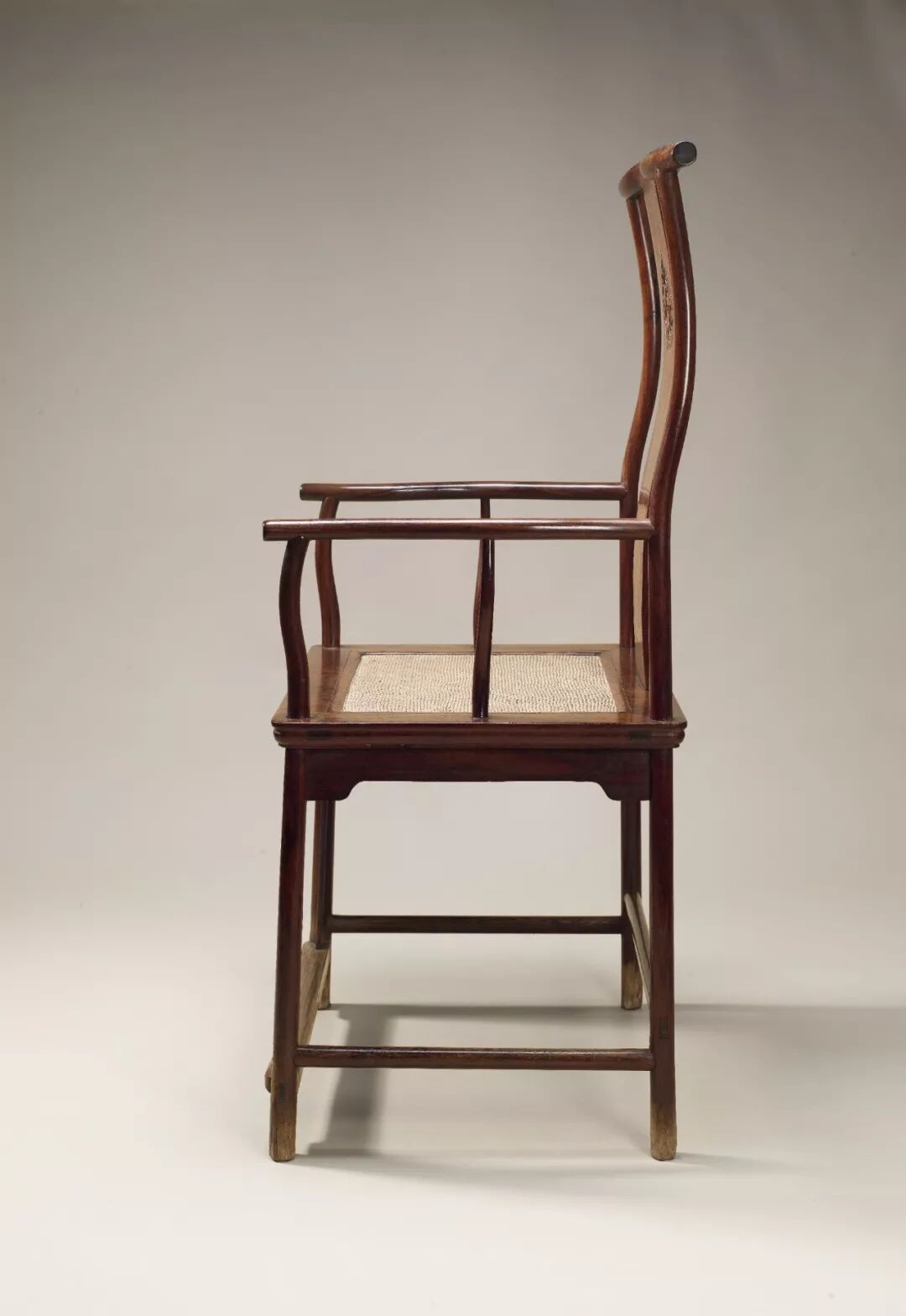 椅圈分五段接成,连接处使用“锲钉榫”使一圈分段连接而不散落。搭脑与扶手一顺而下,圆婉柔和。