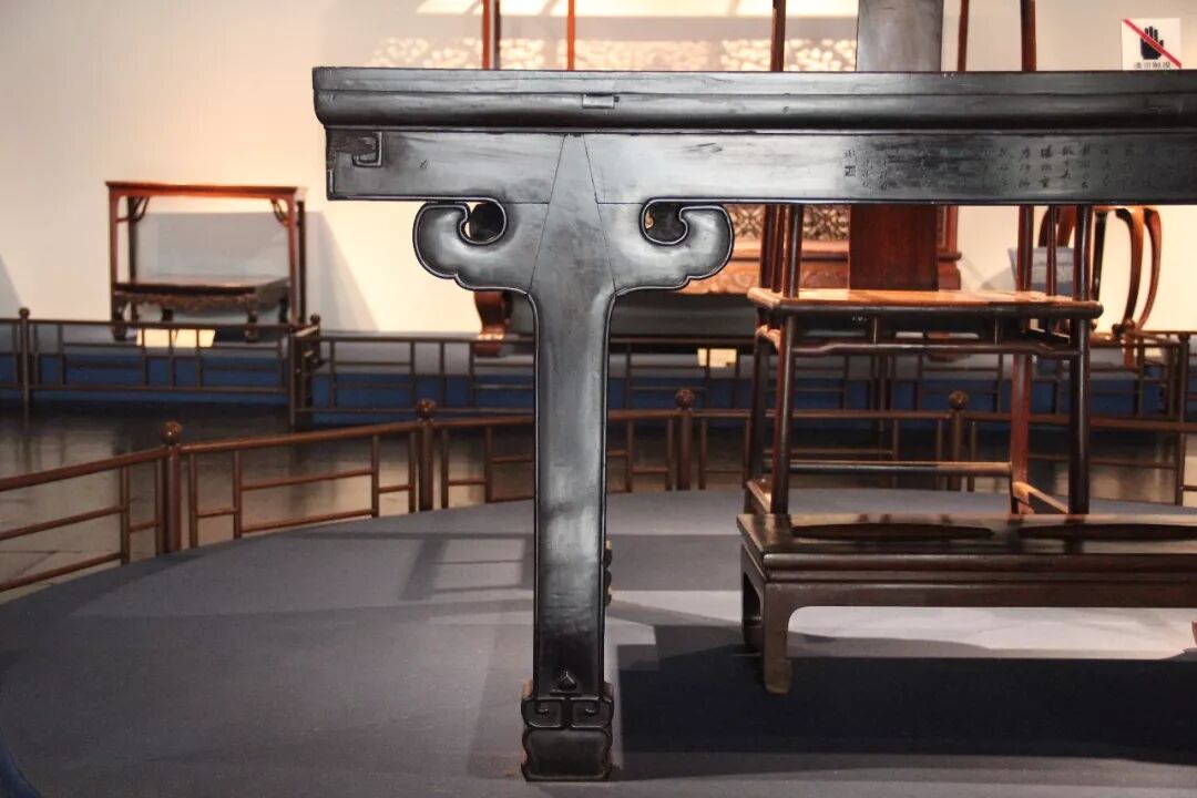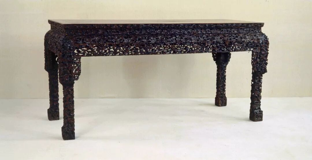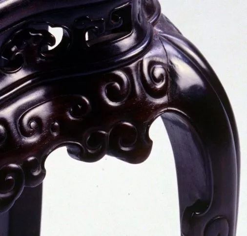 它采用齐牙条的作法,即牙条与桌腿不是45°斜面相接,而是作垂直平接使得细致雕刻的双螭卷草灵芝纹得以完整呈现。