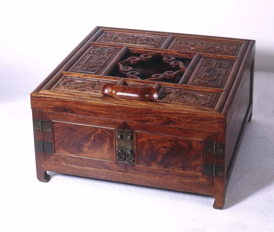 该此镜台为折叠式,较为特殊,顶端的盖板可以支撑起大约60度的角度,采用为攒框装板的做法,内分八格,除六格内装板浮雕螭纹以外,正中一格用角牙构成透空的四簇云纹,可以承托铜镜。