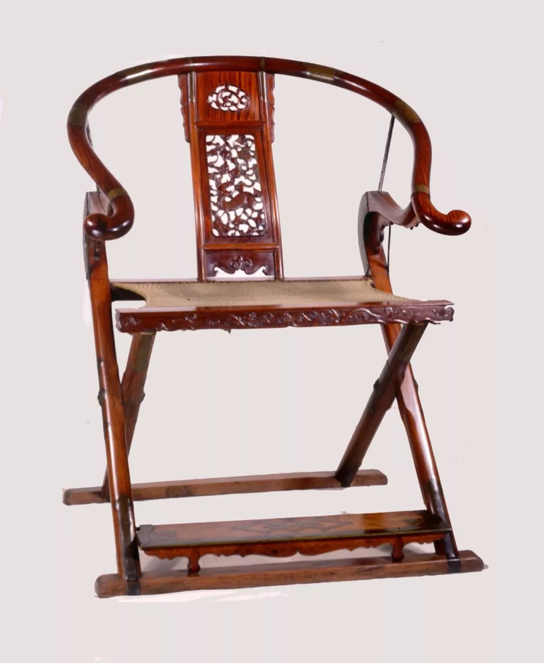 靠背板以攒框镶板的方式制成,上为透雕螭纹,中为透雕麒麟纹,下为壼门亮脚。