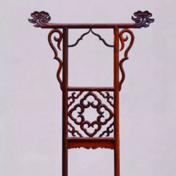 在矮面盆架的后二足向上伸展,形成腰枨、中牌子、搭脑、挂牙,颇具装饰效果,搭脑上可挂手巾。