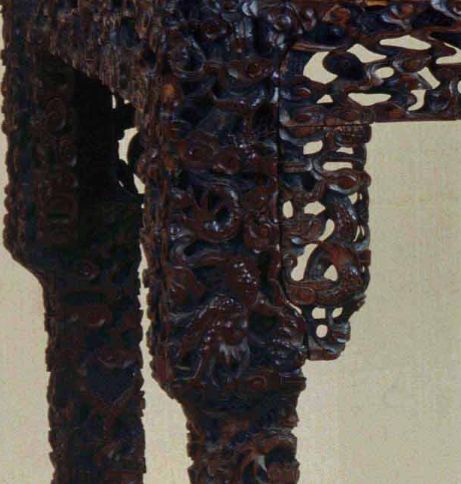 该案面板四边剔地满雕传统的云蝠纹,有“福运连绵”之意,几座却雕刻西方宫廷艺术风格的番莲纹。