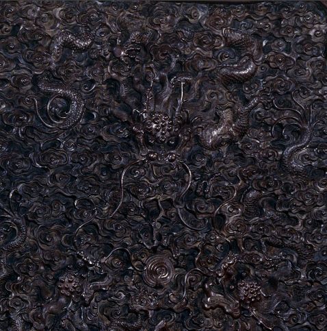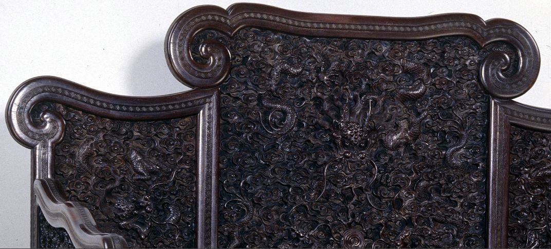 靠背正面中央雕一龙从天而降,其下雕二龙戏珠,再下雕江河山岳,真龙天子君临江山,两侧扶手雕云龙纹。