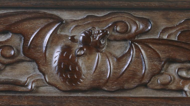 这件家具体量庞大,重达数百斤,用料粗壮厚实,牛毛纹密布,柜门浮雕龙纹两组,龙皆五爪,气势不凡。柜门和膛板分别雕“苍龙教子”和“二龙戏珠”。