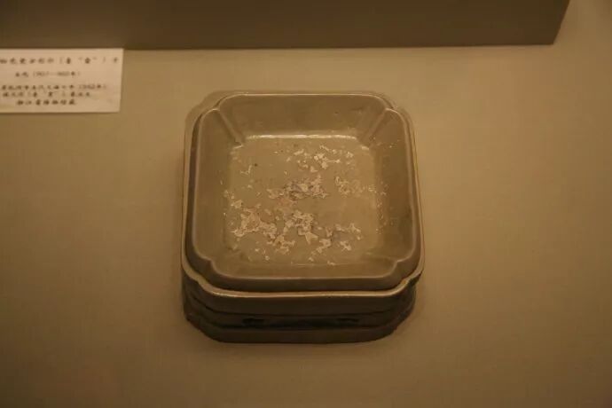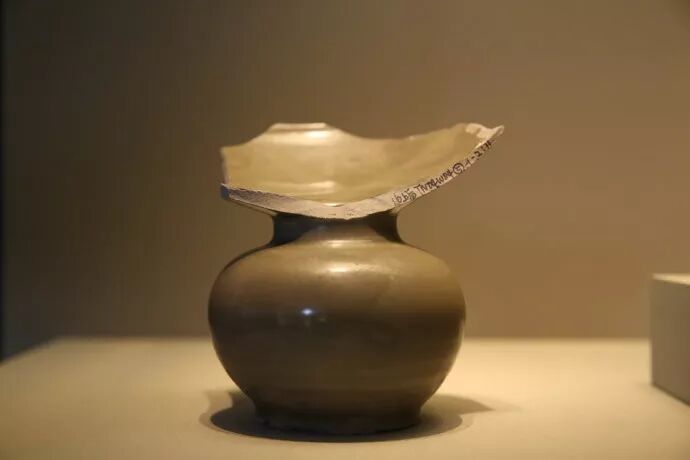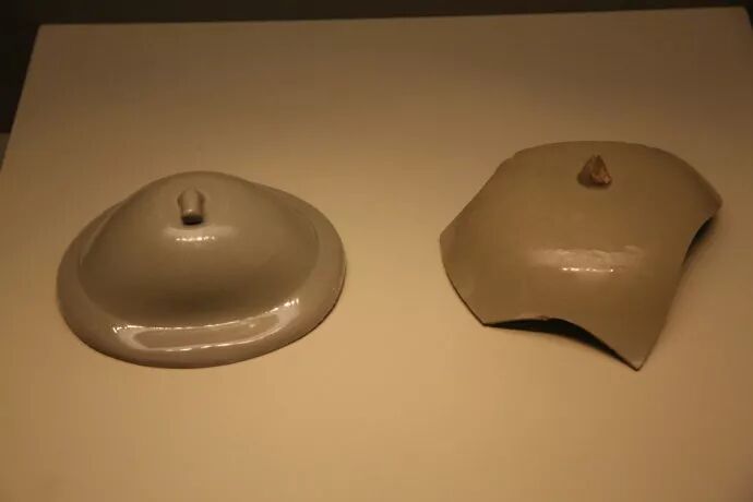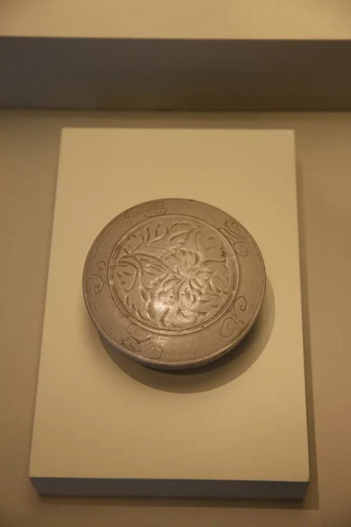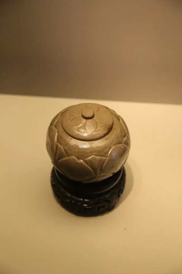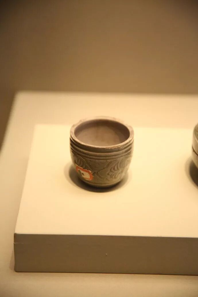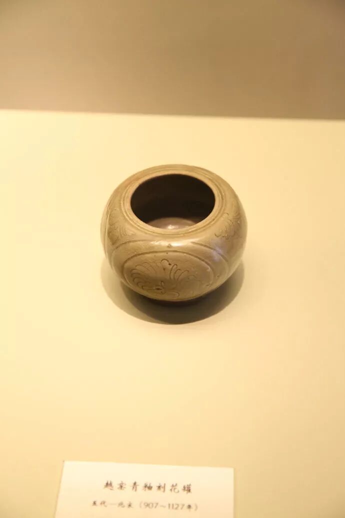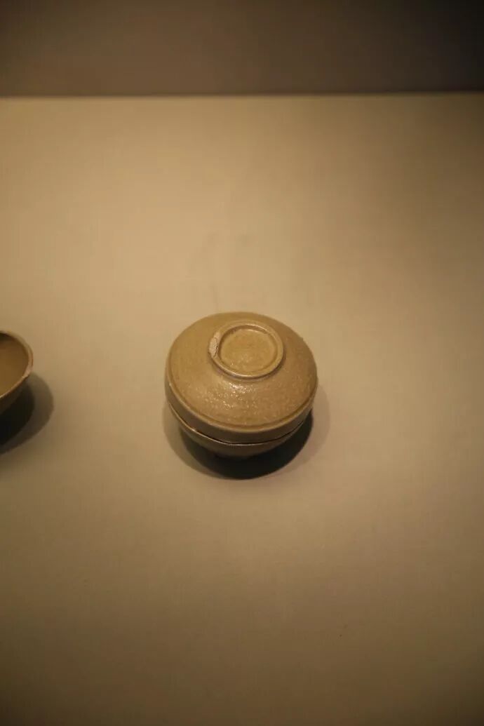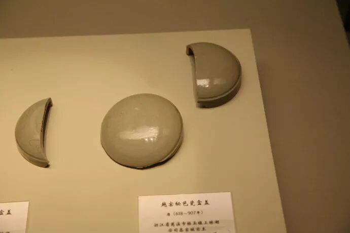 展览中还有一个出土的墓志罐,说明了越窑的产地所在——浙江省慈溪市上林湖地区。罐子上的铭文翻译为:“中和五年岁在乙巳三月五日,终于明州慈溪县上林乡……光启三年(887年)岁在丁未二月五日,殡于当保贡窑之北山。”