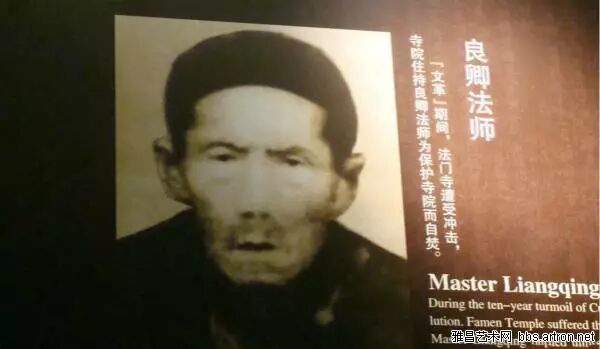 文革期间宝塔又遭劫难,红卫兵多次“光顾”寺院,法门寺的很多文物被破坏。1967年7月20日,一群红卫兵气势汹汹而来,欲挖掘破坏塔下地宫。时任法门寺主持的良卿法师多方劝阻无效,并遭到殴打。为了护寺,良卿法师身穿袈裟,端坐于柴草上引火**!挖掘地宫的红卫兵被吓坏了,慌忙四散而去。就这样,良卿法师用自己的生命保护了佛塔地宫,塔下文物得以保全!