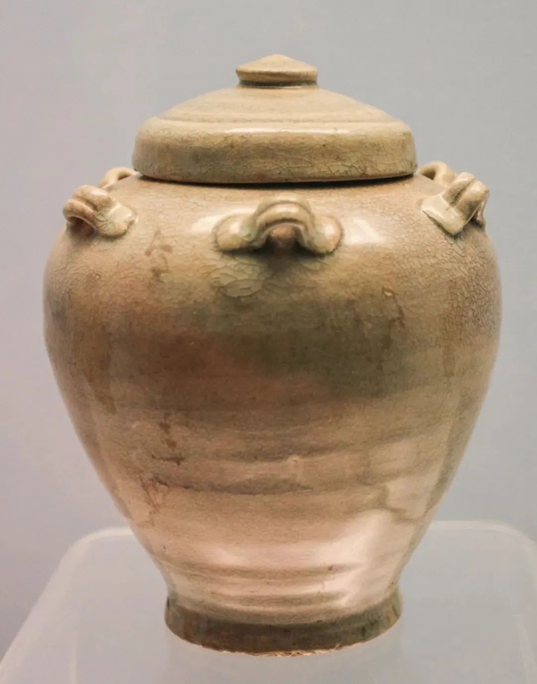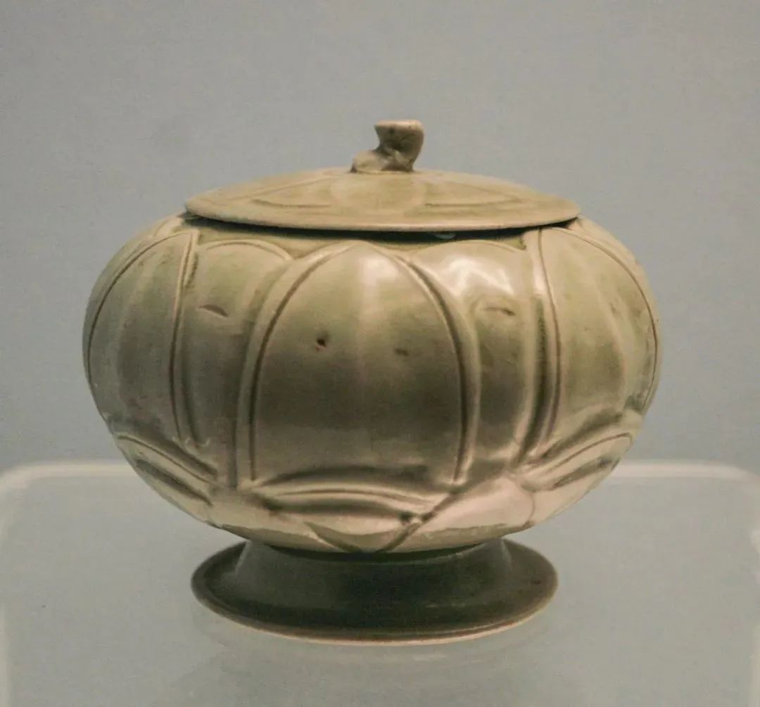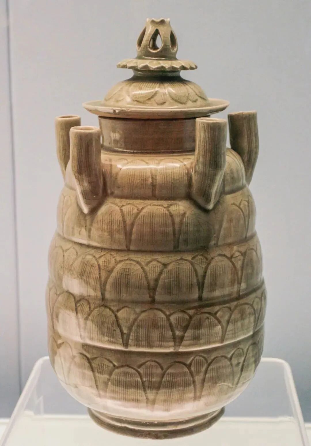 龙泉窑青釉刻花莲瓣纹五管盖罐