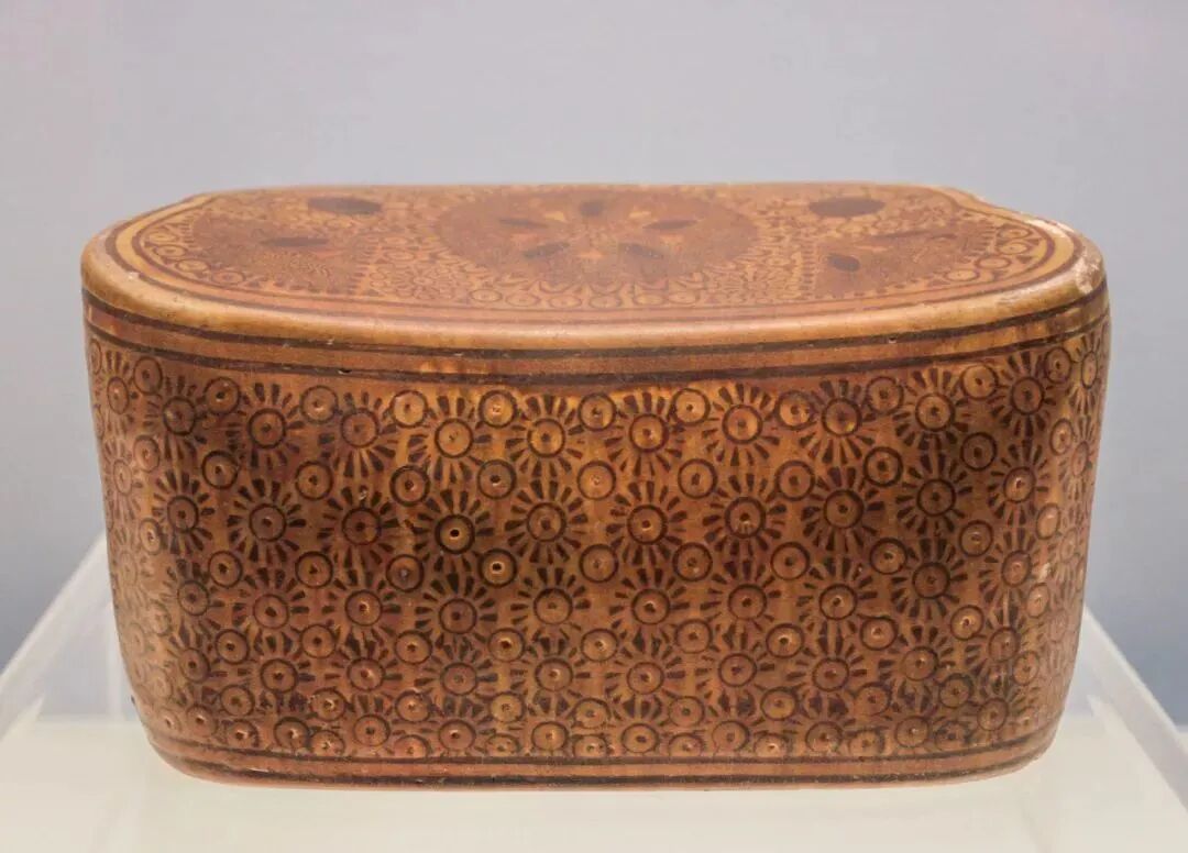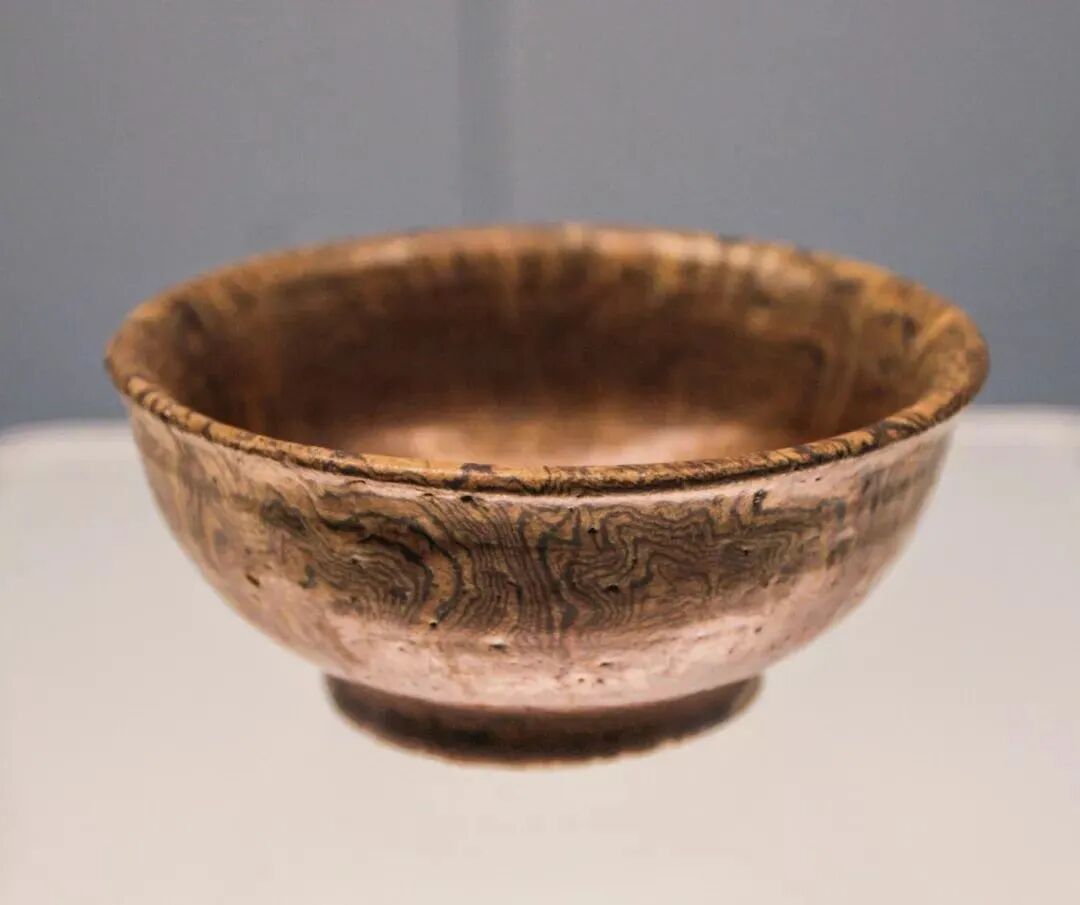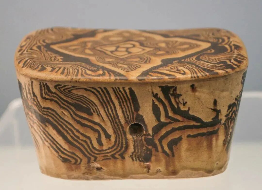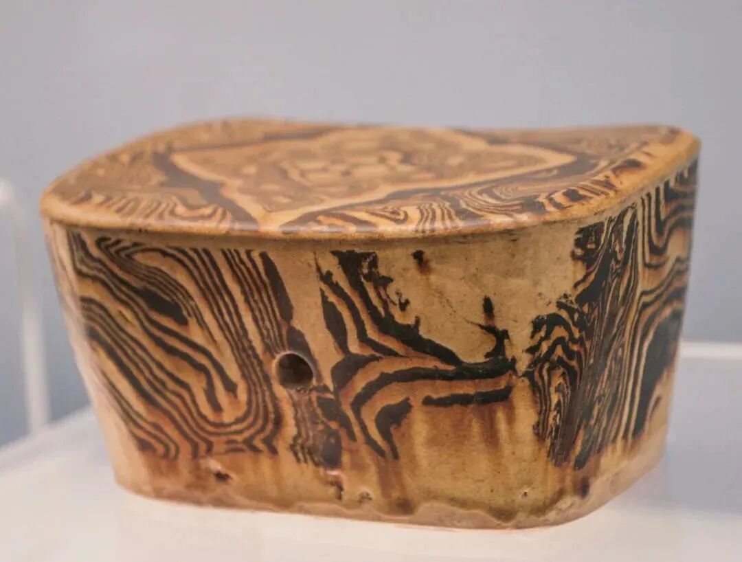 绞胎是唐代一种新颖陶器制作工艺。制作方法系用白、褐两色(或多色)陶土相间糅合、按需要切成片后贴于器物表面,有的产品整器胎体相绞而成,然后施釉烧造而成。纹饰多样化,最常见的是木理纹,颇有特色。